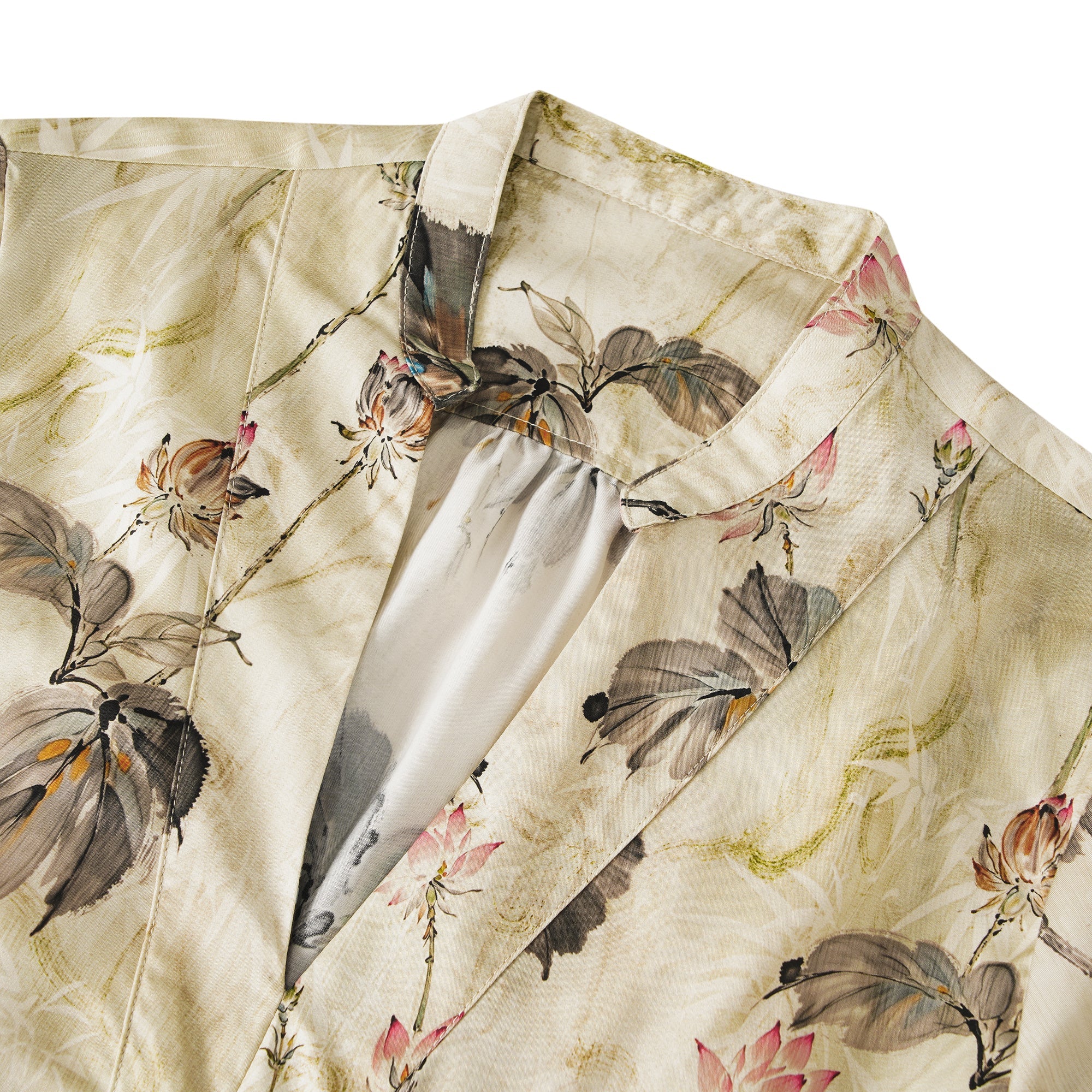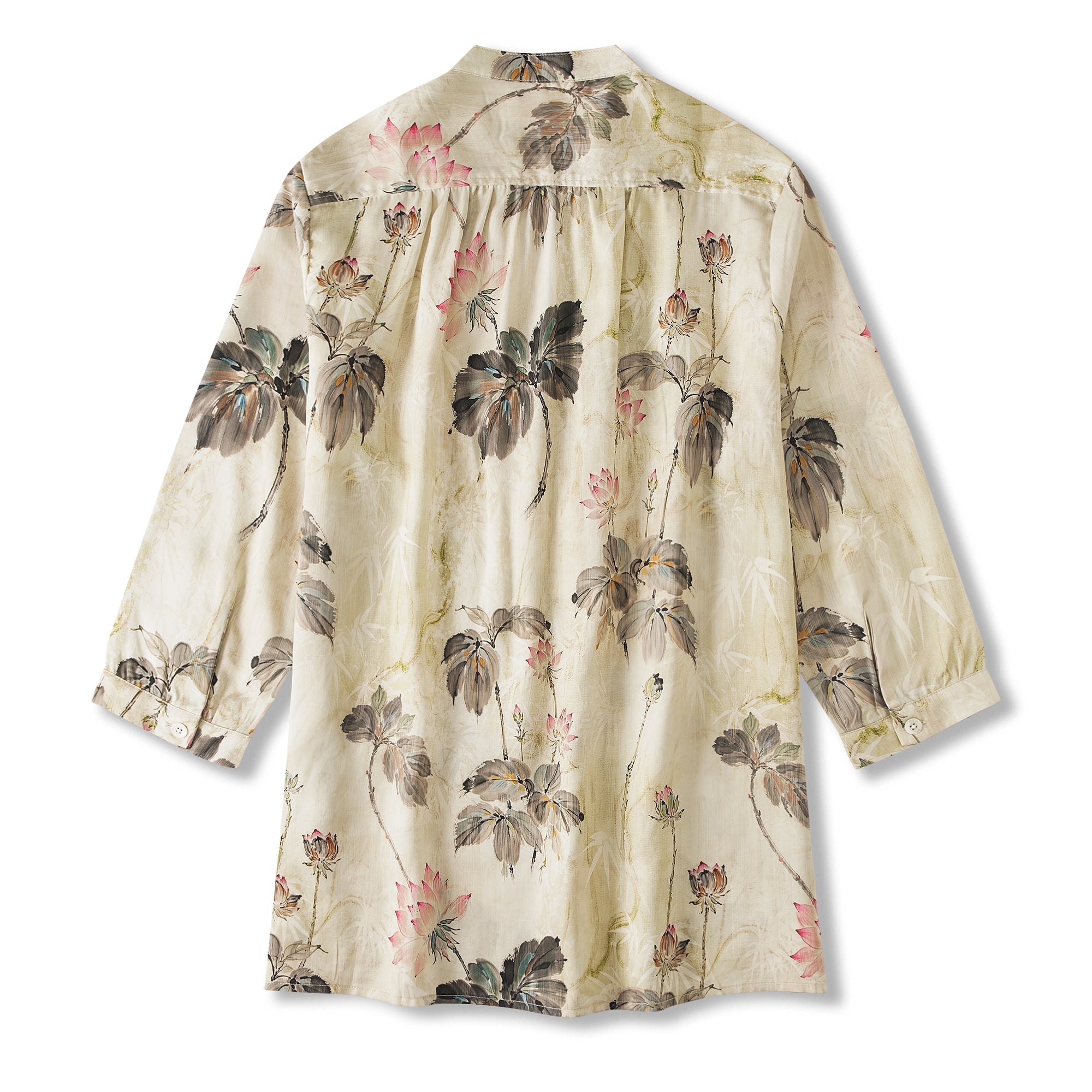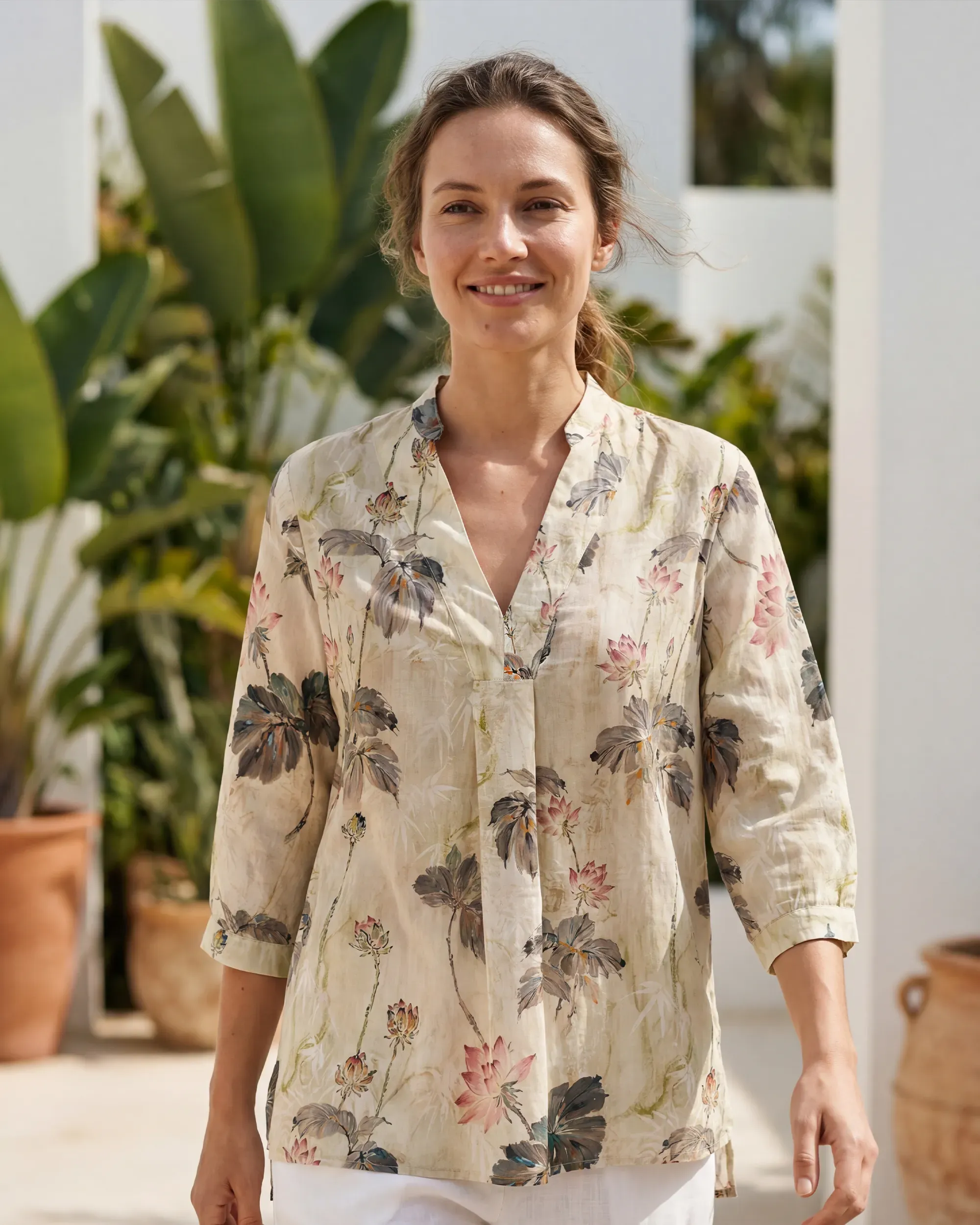Women Casual Blouse 3/4 Sleeve V-neck Shirt Collar 100% Lyocell Green Aloha Lotus Charm