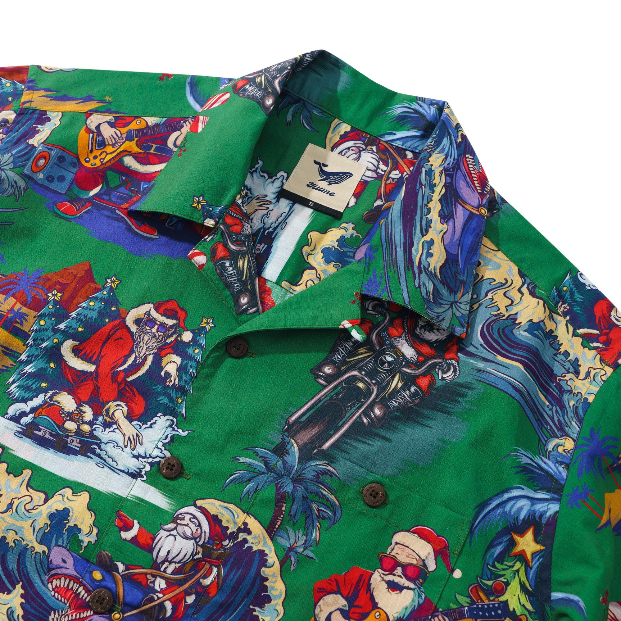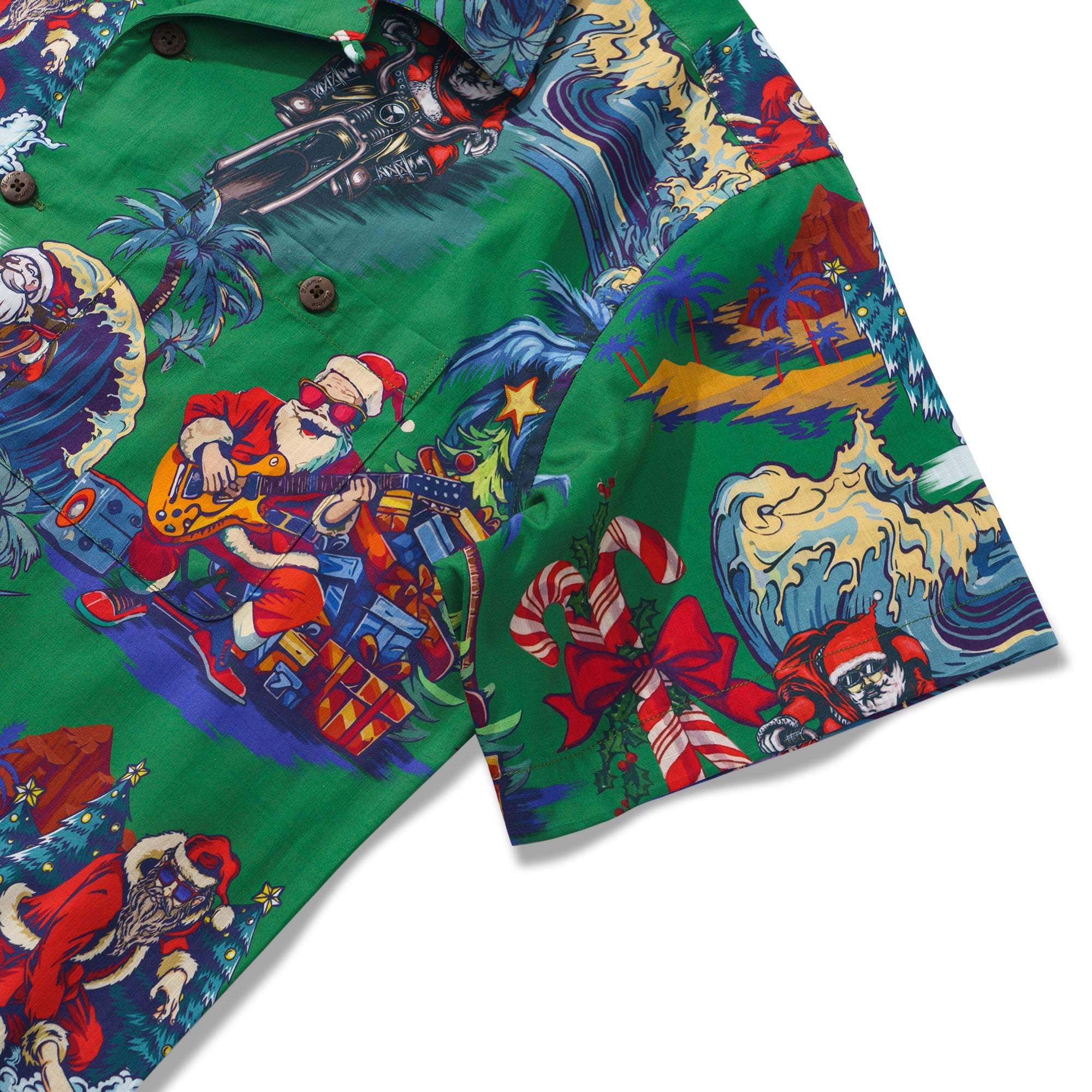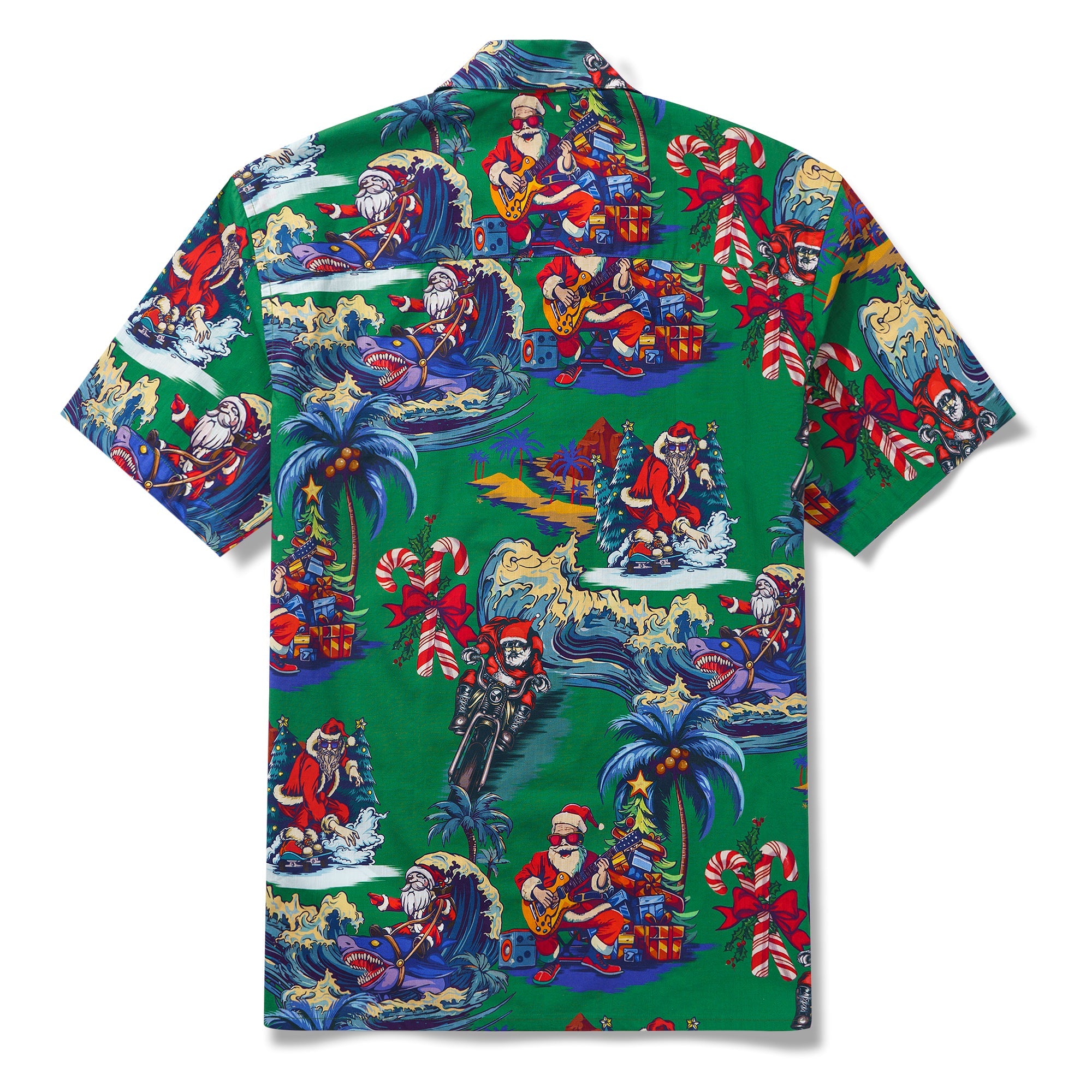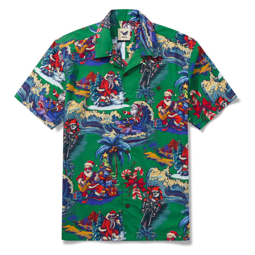 Feiere diese festliche Saison in einem fröhlichen und lebhaften hawaiianischen Stil mit unserem einzigartigen Weihnachtshemd. Vor einem üppig grünen Hintergrund erwachen mehrere Weihnachtsmannfiguren in verschiedenen verspielten Szenen zum Leben, wobei jeder auf seine eigene Weise den besonderen Tag feiert. Einige Weihnachtsmänner surfen und verwandeln den Ozean in ihren Spielplatz; andere fahren mit Motorrädern durch die Straßen und verbreiten Freude und Lachen in jeder Ecke. Einige spielen Gitarre und verbreiten Botschaften von Liebe und Frieden durch Musik; und es gibt sogar einen Weihnachtsmann, der Skateboard fährt und auf die coolste Art und Weise Segnungen verteilt. Umgeben von Palmen, Weihnachtsbäumen und wunderschön verpackten Geschenken schafft dieses Hemd eine gemütliche und traumhafte Welt, die dich nach der Feiertagssaison sehnen lässt.Begleiten Sie uns bei der Begrüßung eines Weihnachtsfestes wie kein anderes, erfüllt von Aloha-Geist und künstlerischem Charme.