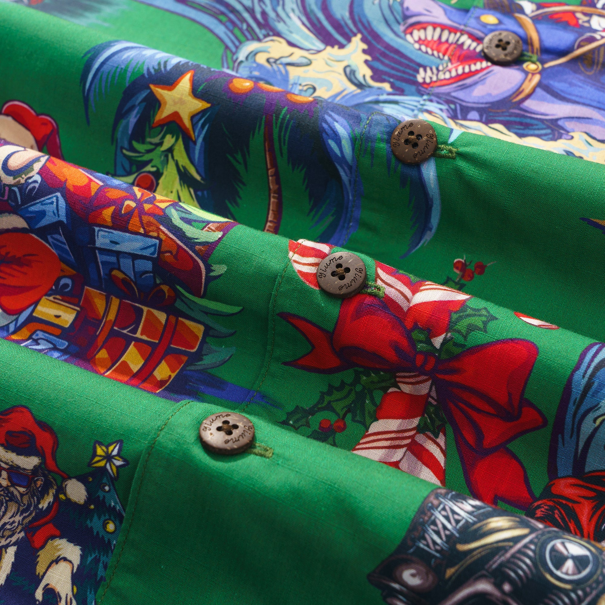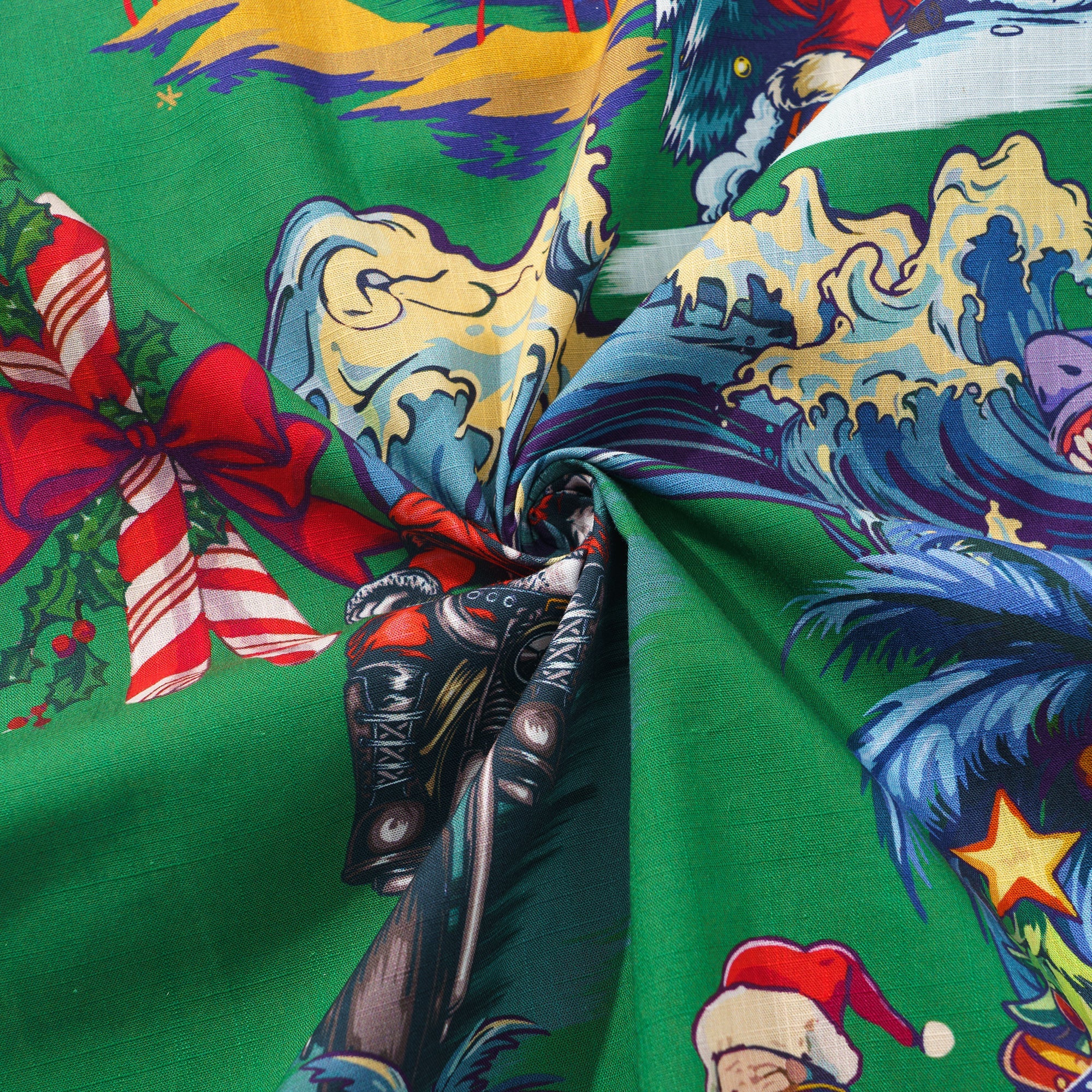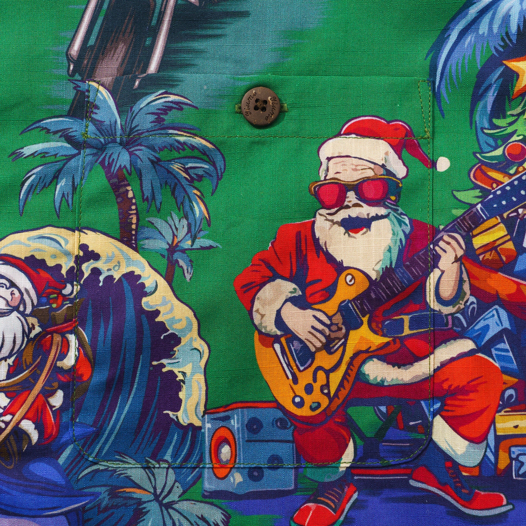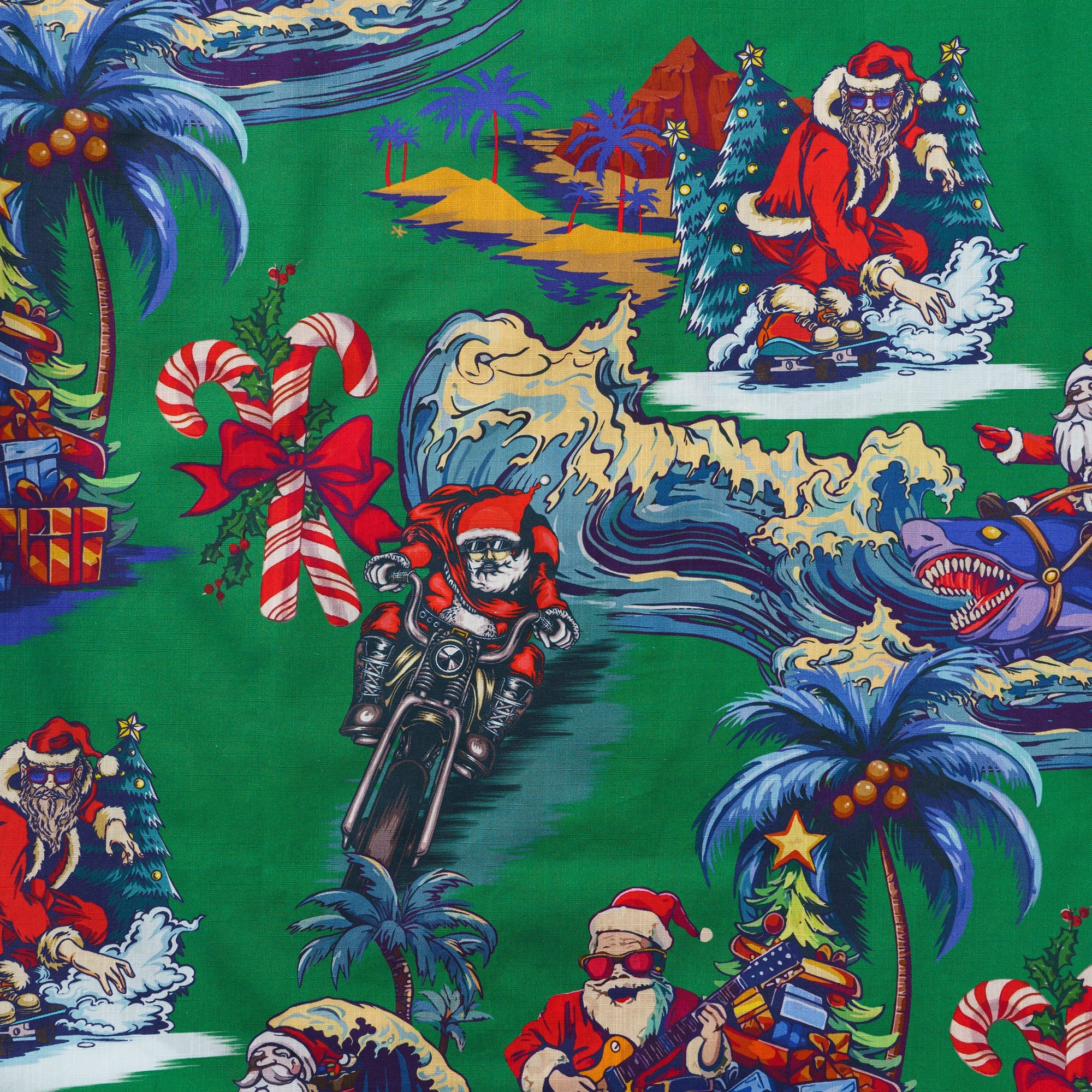 Feiere diese festliche Saison in einem fröhlichen und lebhaften hawaiianischen Stil mit unserem einzigartigen Weihnachtshemd. Vor einem üppig grünen Hintergrund erwachen mehrere Weihnachtsmannfiguren in verschiedenen verspielten Szenen zum Leben, wobei jeder auf seine eigene Weise den besonderen Tag feiert. Einige Weihnachtsmänner surfen und verwandeln den Ozean in ihren Spielplatz; andere fahren mit Motorrädern durch die Straßen und verbreiten Freude und Lachen in jeder Ecke. Einige spielen Gitarre und verbreiten Botschaften von Liebe und Frieden durch Musik; und es gibt sogar einen Weihnachtsmann, der Skateboard fährt und auf die coolste Art und Weise Segnungen verteilt. Umgeben von Palmen, Weihnachtsbäumen und wunderschön verpackten Geschenken schafft dieses Hemd eine gemütliche und traumhafte Welt, die dich nach der Feiertagssaison sehnen lässt.Begleiten Sie uns bei der Begrüßung eines Weihnachtsfestes wie kein anderes, erfüllt von Aloha-Geist und künstlerischem Charme.
