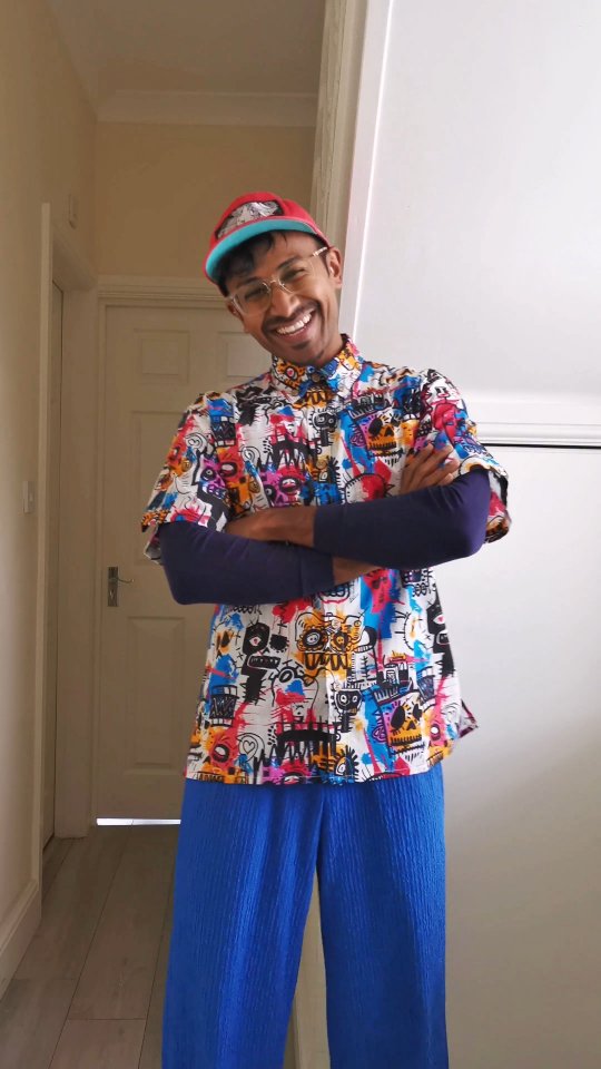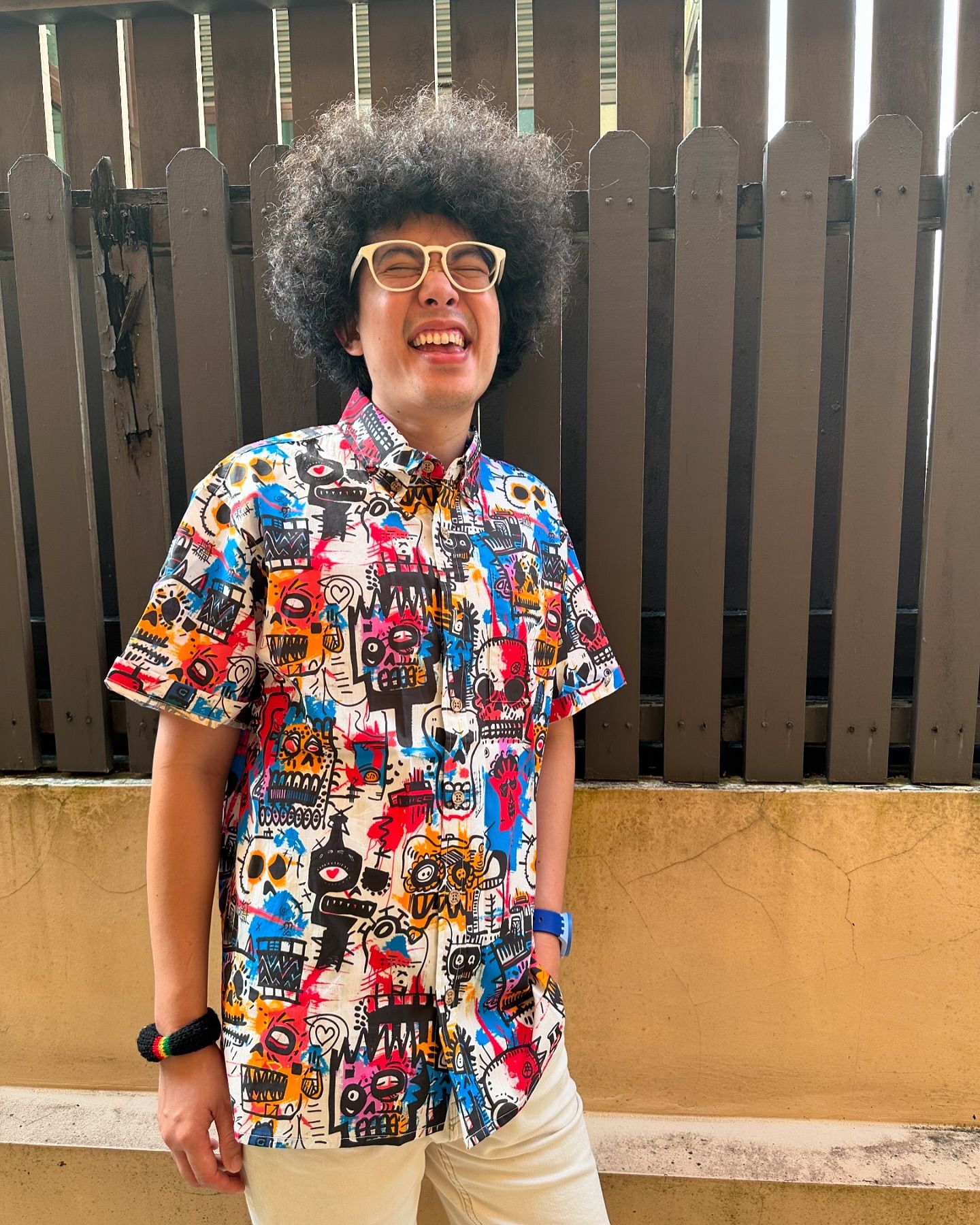 Hokusai inspired Fujiyama Ocean theme blue on white Aloha button down short sleeve shirt was out of its mail box and onto me within an hour! Pictured on me as we visited Christmas Train exhibition Flower Dome Singapore. Shirt is a work of art. Appreciate the spare buttons attached to the laundry instructions tag. Comfortable (although I chose one size too big)