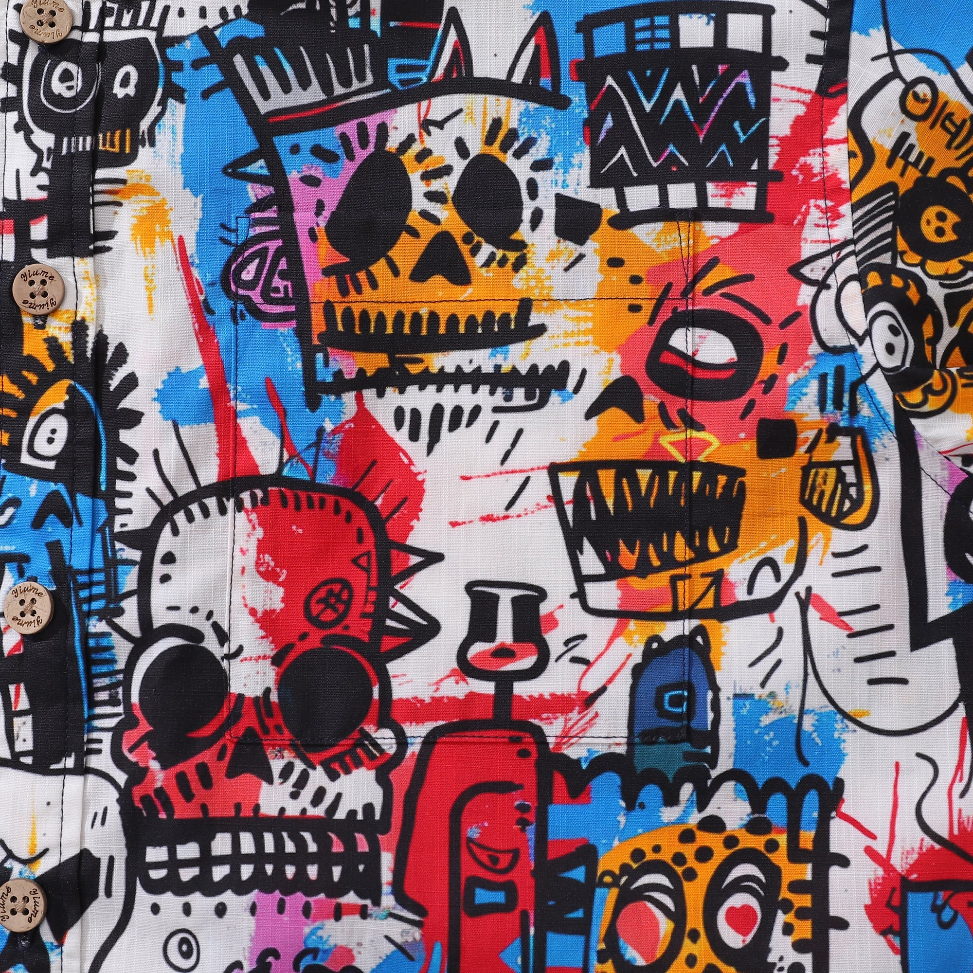 Das Design dieses Shirts strotzt nur so vor Kreativität und verbindet nahtlos Graffiti-Stil mit Halloween-Elementen. Das Muster ist mit verschiedenen Totenköpfen, Spinnennetzen, Geistern und Kürbissen gefüllt und setzt leuchtende Farbkontraste ein, um jedes Detail hervorzuheben und interessant zu gestalten. Das Design verströmt eine spontane und lässige Street-Art-Atmosphäre, fängt den Spaß und die freie Meinungsäußerung an Halloween ein und feiert die Kreativität und den ausgelassenen Geist dieses Feiertags.