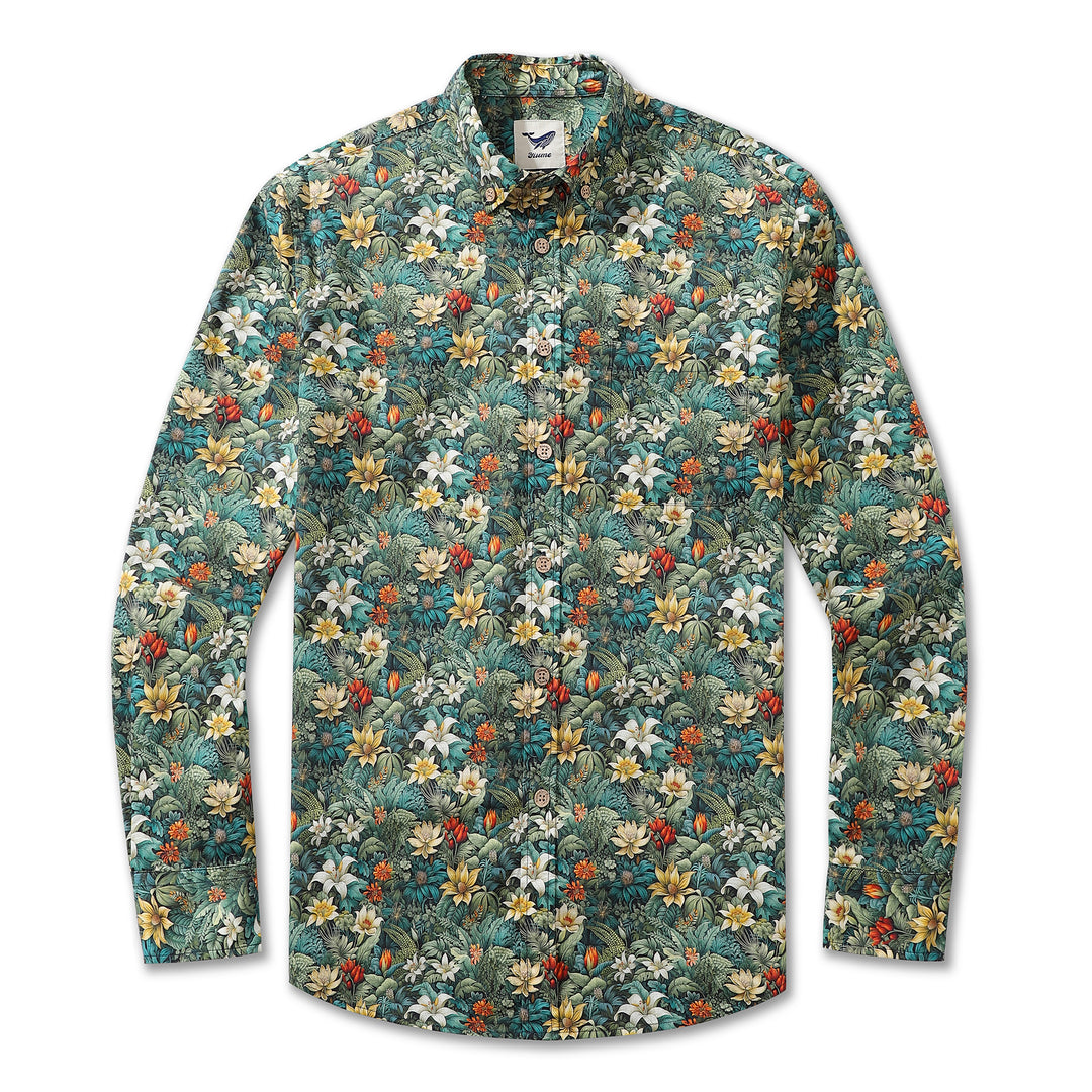 Herren Hawaii-Hemd Dschungel-Abenteuer-Druck Baumwolle Knopfverschluss Langarm Aloha-Hemd
