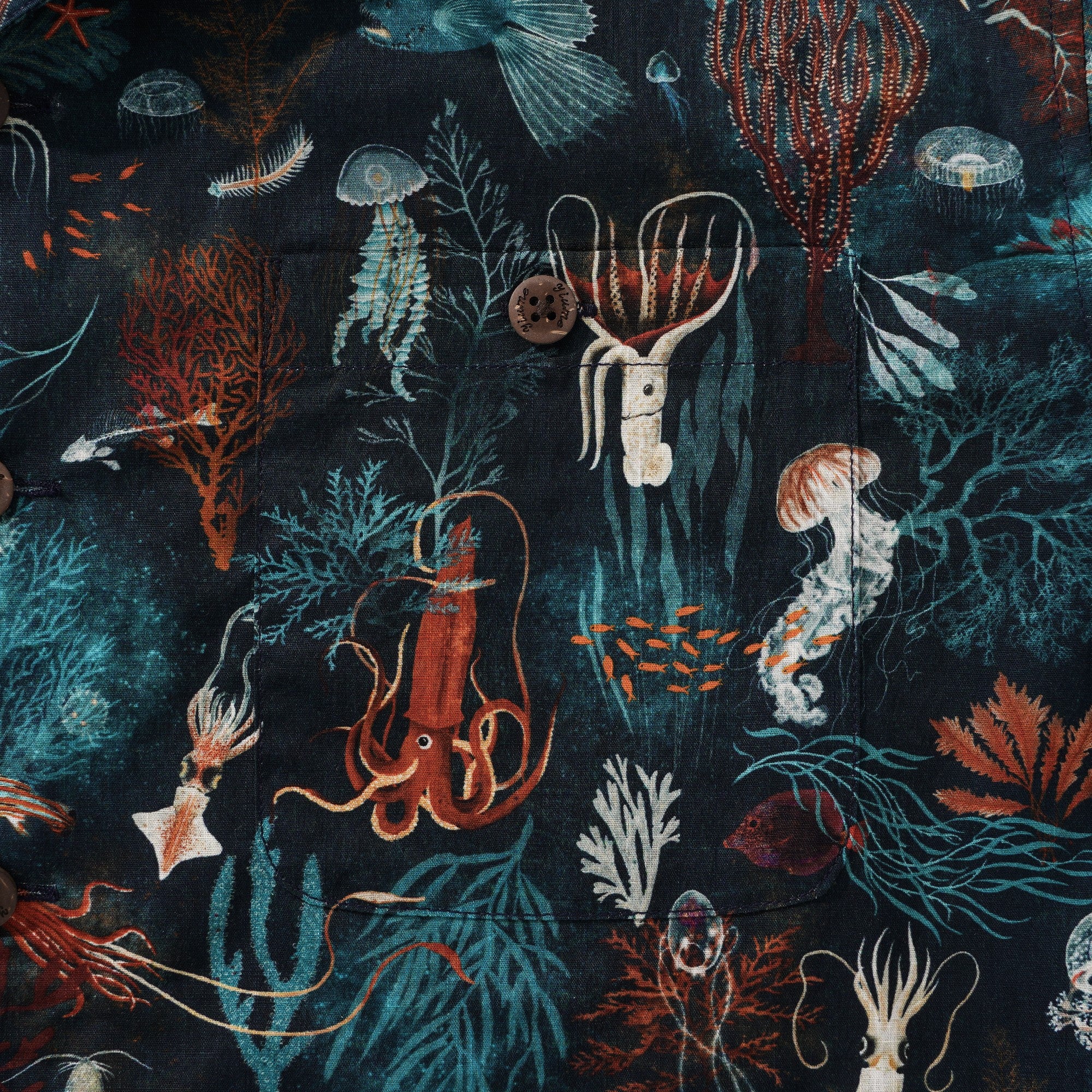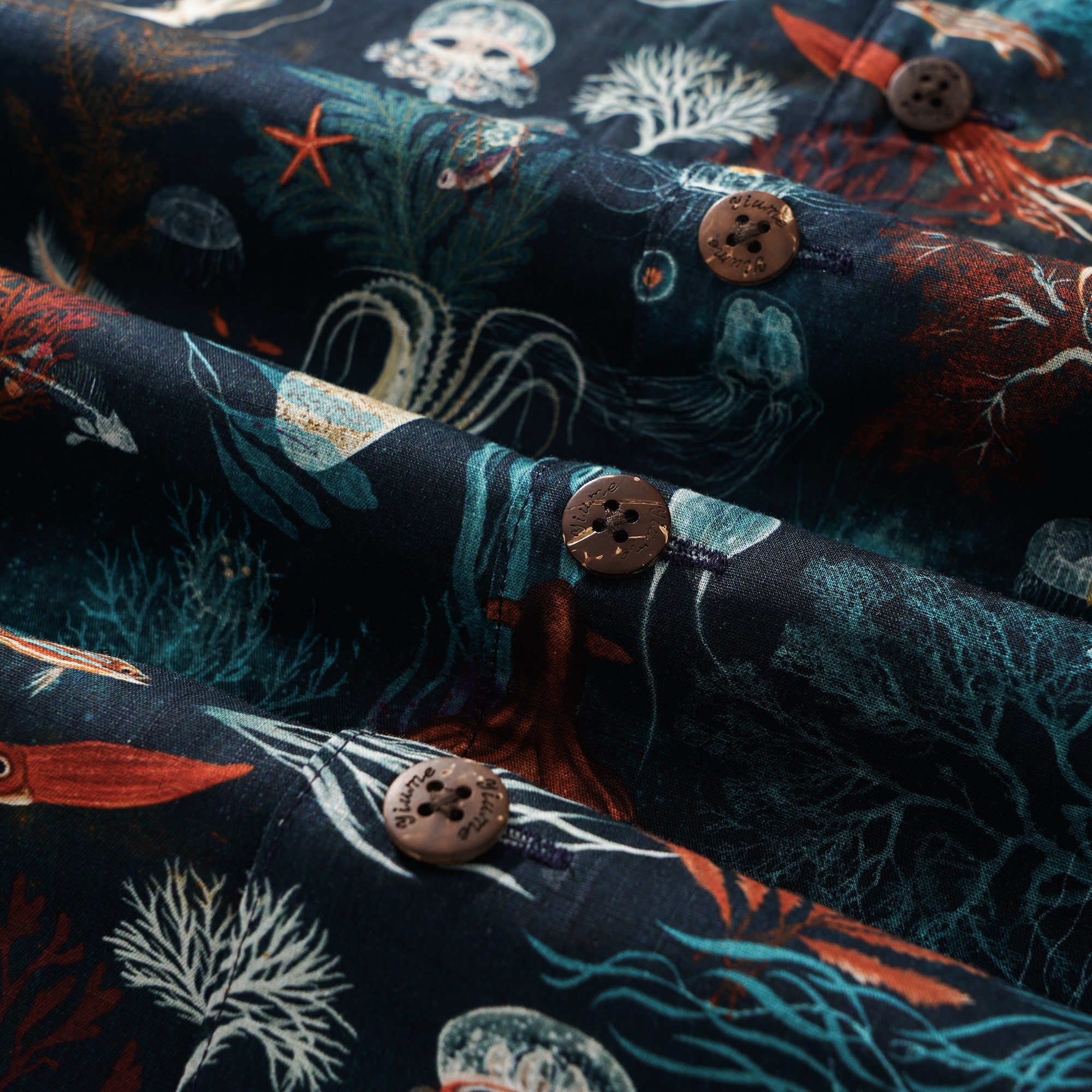 Diese exquisiten Hemden spiegeln meine anhaltende Leidenschaft für den Ozean und die bezaubernden Geheimnisse wider, die er unter der Oberfläche birgt, und sind eine Hommage an den anmutigen Tanz der Quallen und die rätselhafte Anziehungskraft der Tintenfische.