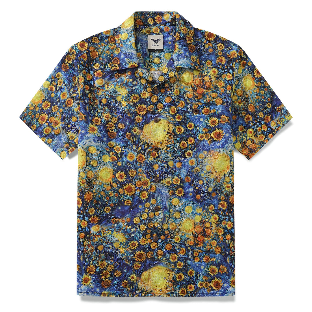 1960er Vintage Hawaiian Shirt für Männer Van Gogh Sonnenblumen Shirt 100% Baumwolle Camp-Kragen Shirt