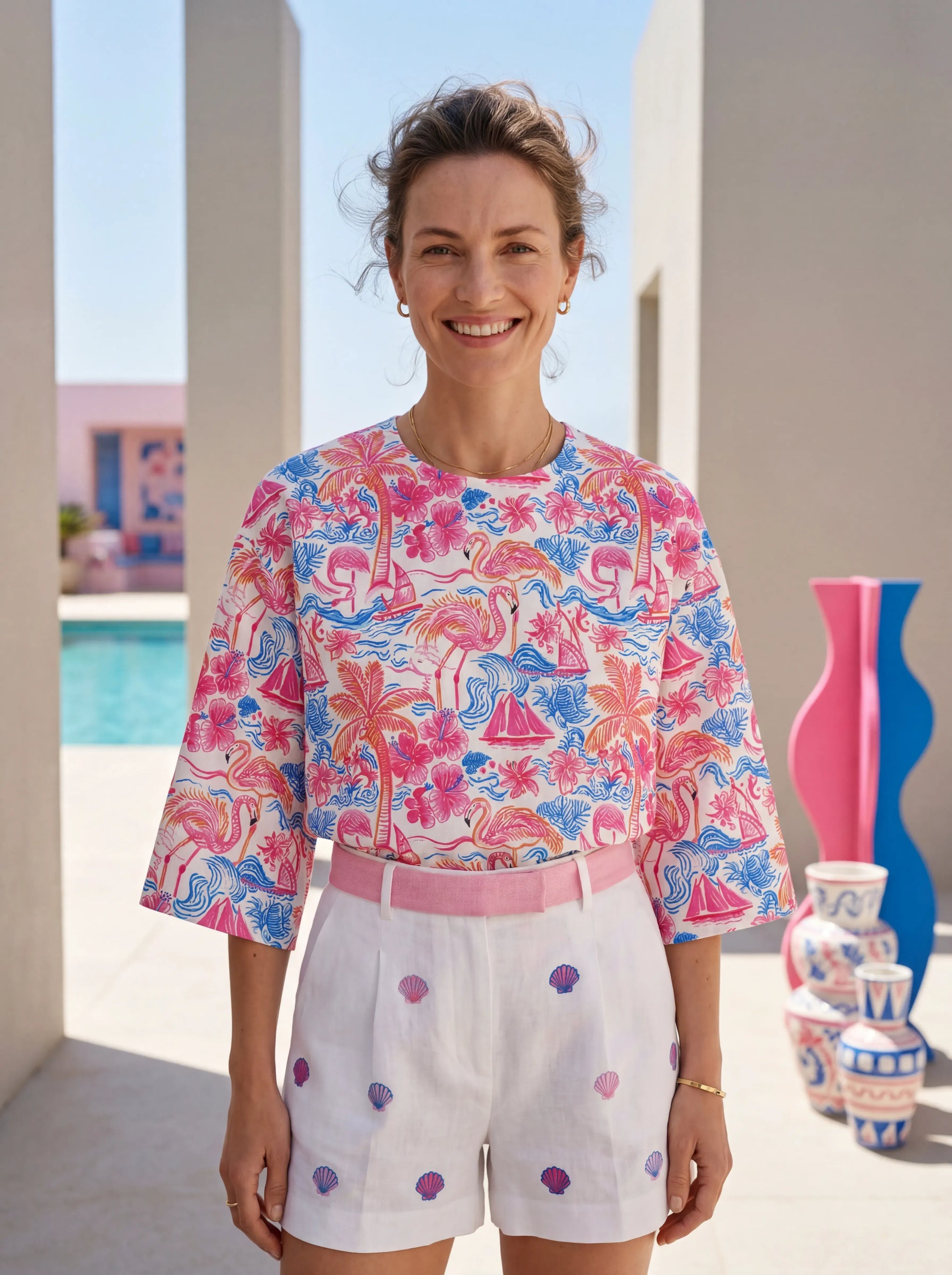 Flamingo Women's Casual Blouse Elbow Sleeve Crew Neck Button-Back 100% Lyocell Aloha Tropical Fire Bay