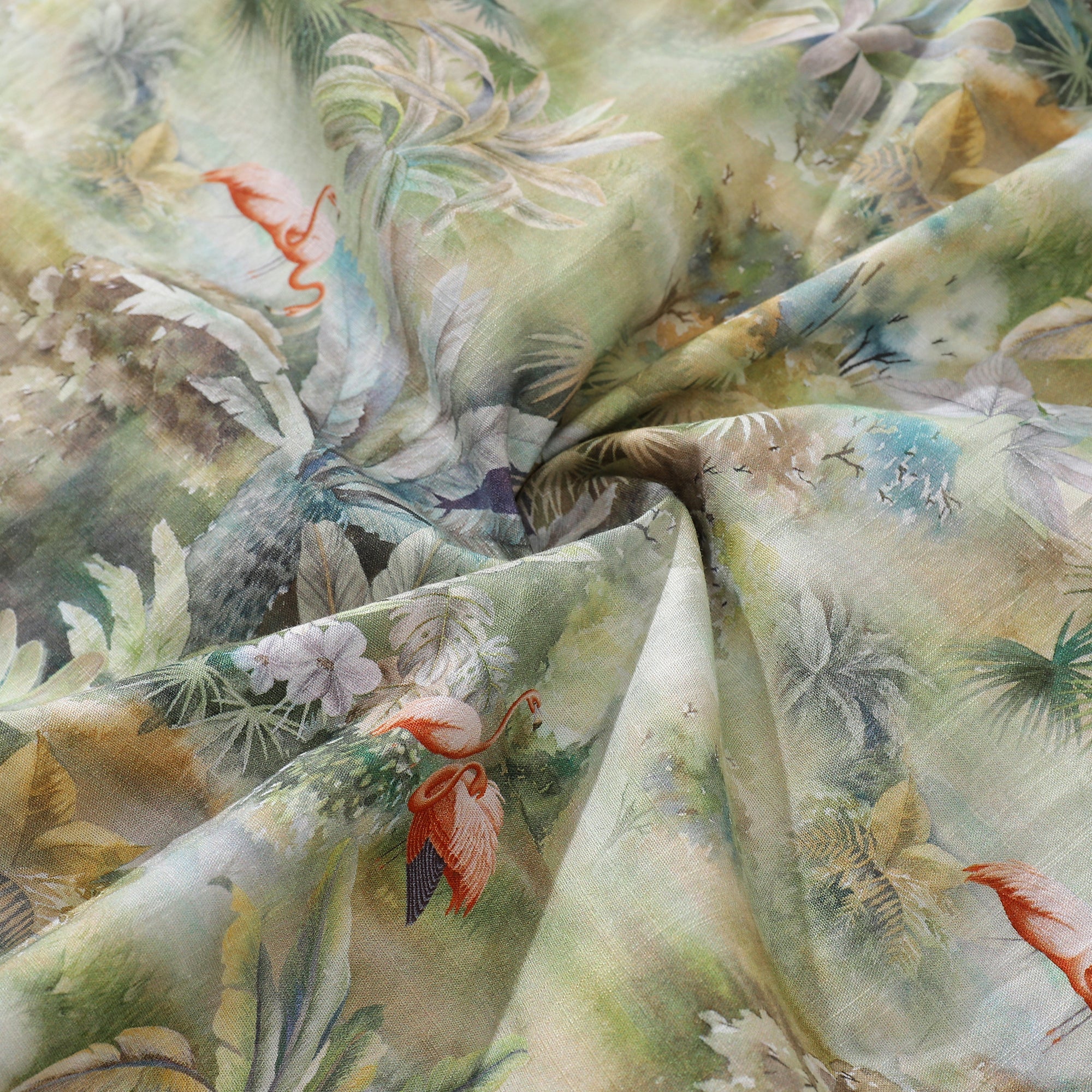 This watercolor landscape painting is incredibly beautiful! In this painting, we can see a lush tropical jungle, where the vegetation is extremely flourishing, with tall trees rising high into the clouds. The green leaves shine brightly in the sunlight. In this verdant world, there are several beautiful flamingos, whose feathers are colorful and very vibrant, forming a stark contrast with the surroundings. The whole scene is very vivid, as if bringing us right into it and allowing us to experience the unique charm of the tropical jungle.