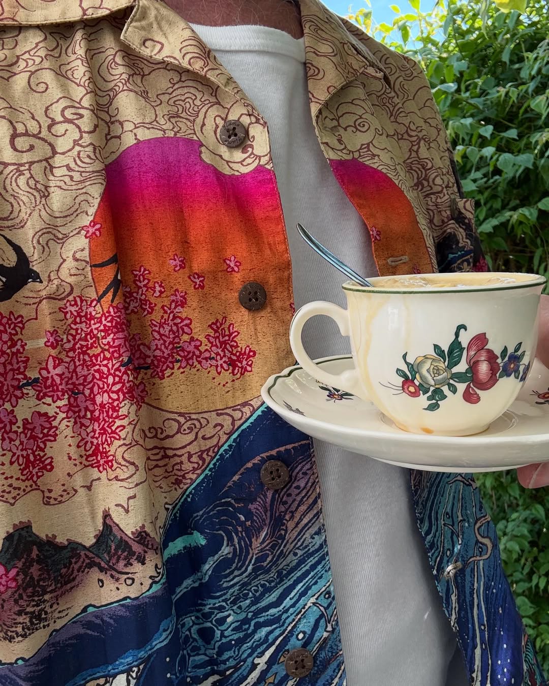 A gorgeous shirt with a bright, colourful design. The sizing is perfect too.I love it, my husband loves it. What more can I say?