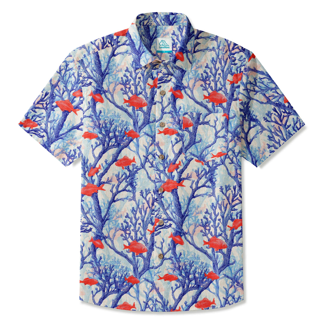 LeosWare® Men's Hawaiian Shirt Short Sleeve Button-up 100% Cotton Blue Aloha Messenger Of The Earth's Red Fish