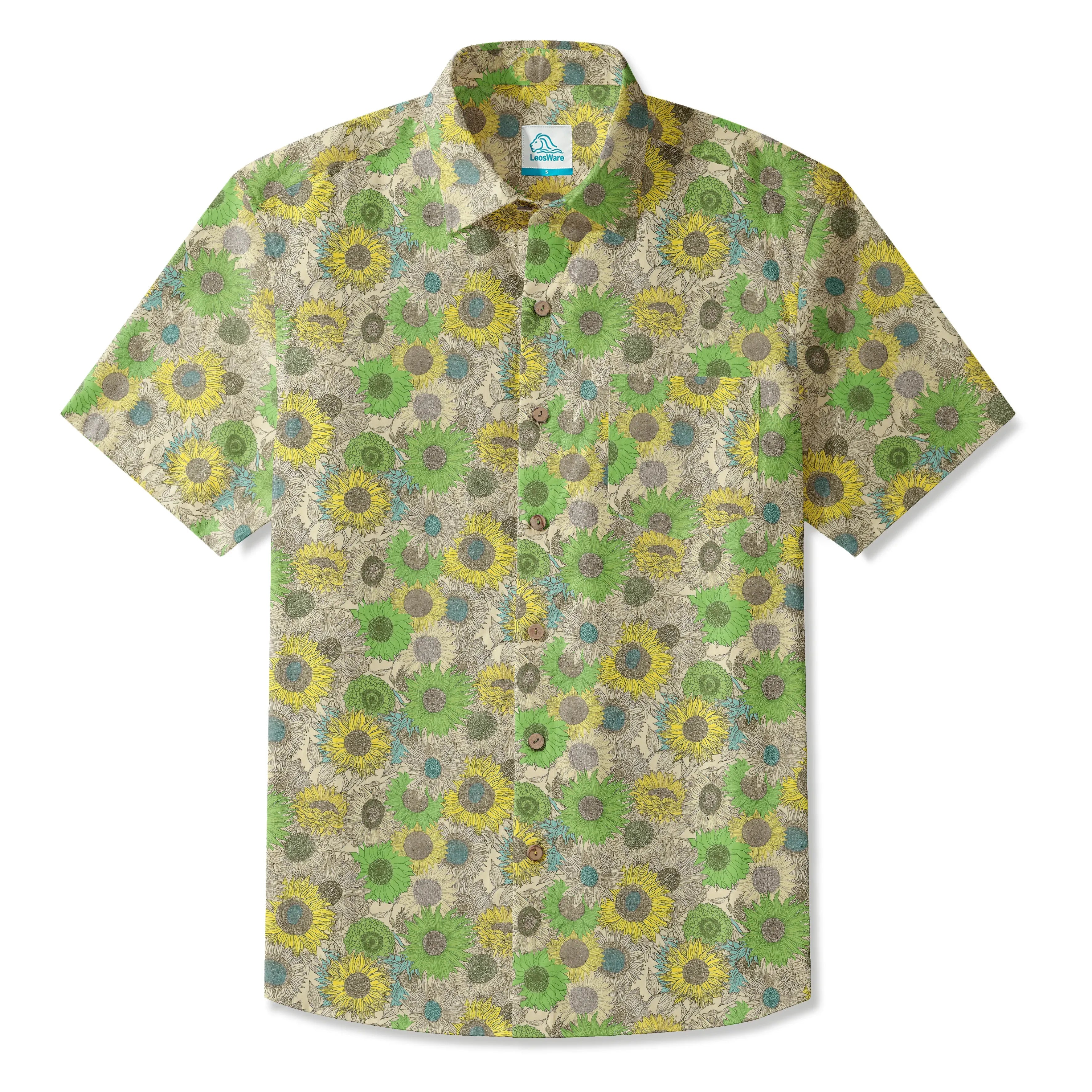 LeosWare® Men's Hawaiian Shirt Short Sleeve Button-up 100% Cotton Green Aloha Earth Day Sunflower Garden Vitality Woven Patch