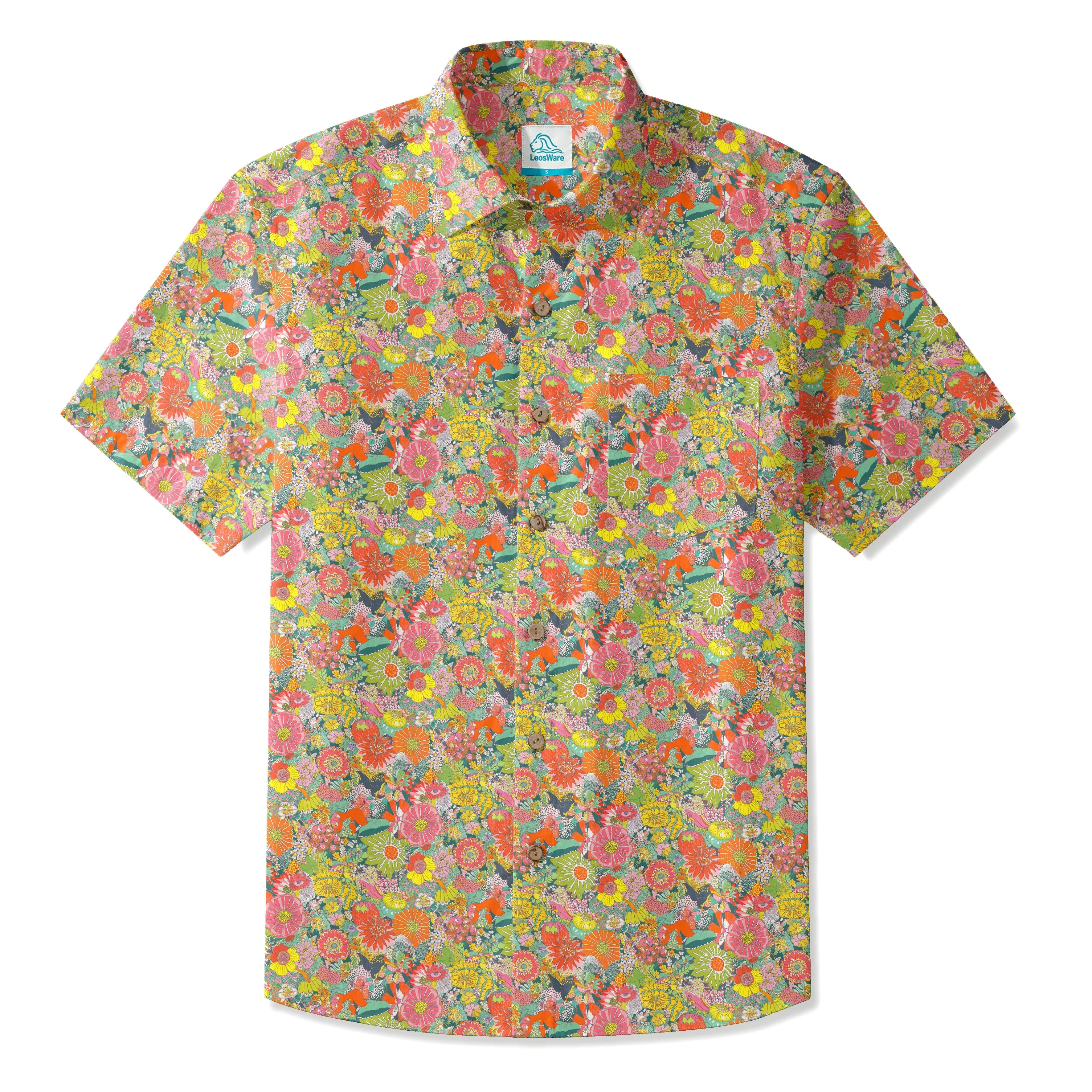 LeosWare® Men's Hawaiian Shirt Short Sleeve Button-up 100% Cotton Green Aloha Spring Blossom Notes