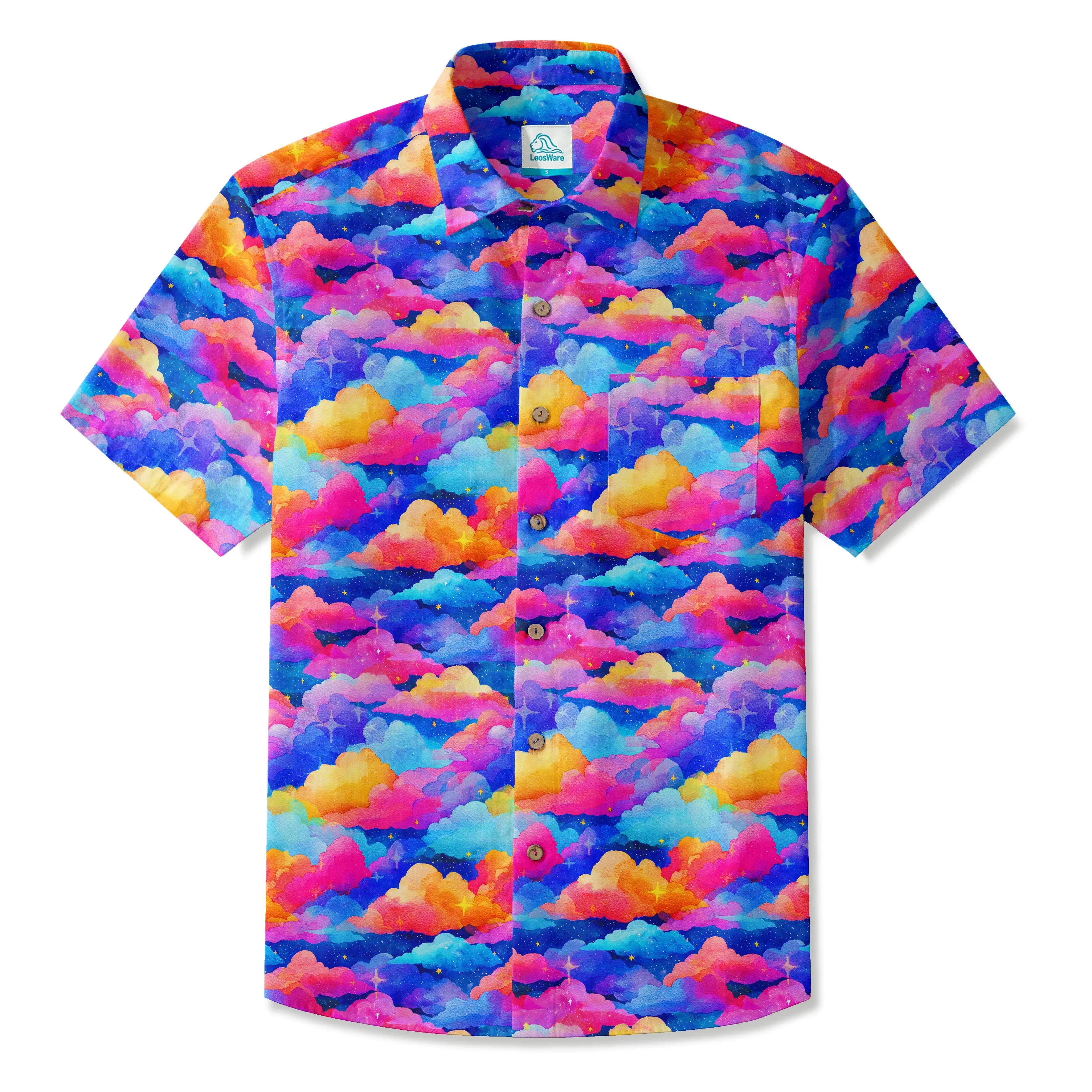 LeosWare® Men's Hawaiian Shirt Short Sleeve Button-up 100% Cotton Orange Aloha Rainbow Clouds Meadow
