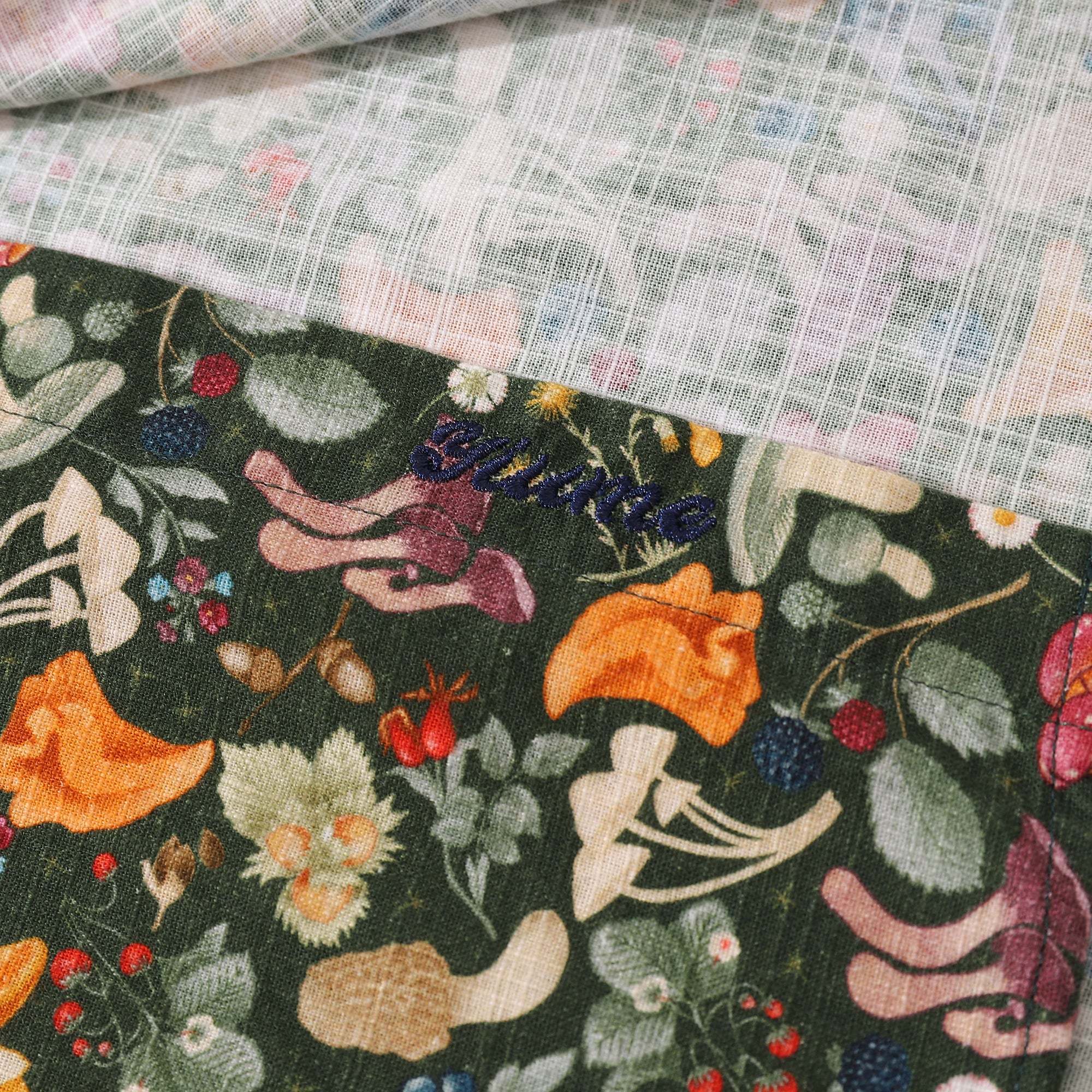 Edible mushrooms were my starting point when creating this pattern, but the forest offers so many other deliciousness. We know about berries and nuts, so you can see I’ve drawn a few for the design, like hazelnuts and Beechnuts. And edible flowers can be found in the forest, too, like the Daisy! With mushrooms and berries, one has to take care to know what to eat, but a fun fact is that every kind of rosehip is edible, and they each have their own palette.
