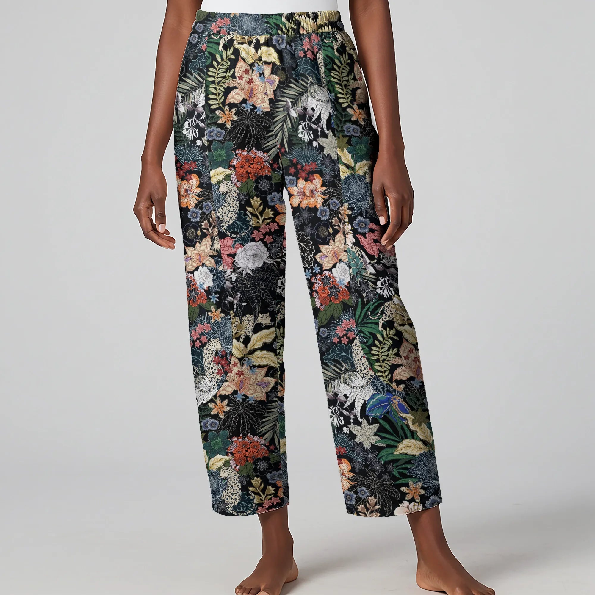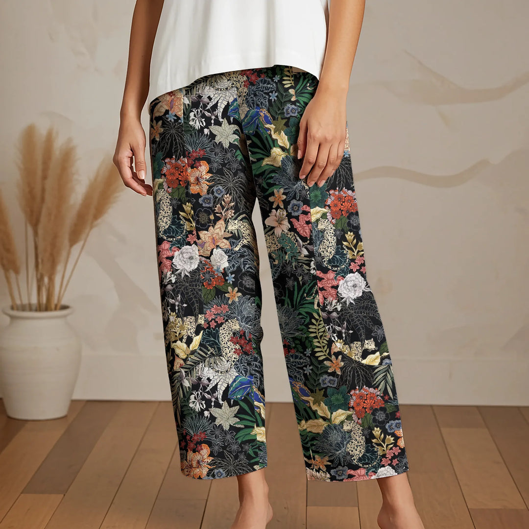 Women Casual Ankle Pants Lounge Elastic Waist with Pockets 93% Lyocell, 7% Linen Black Aloha The Night Jungle Exploring