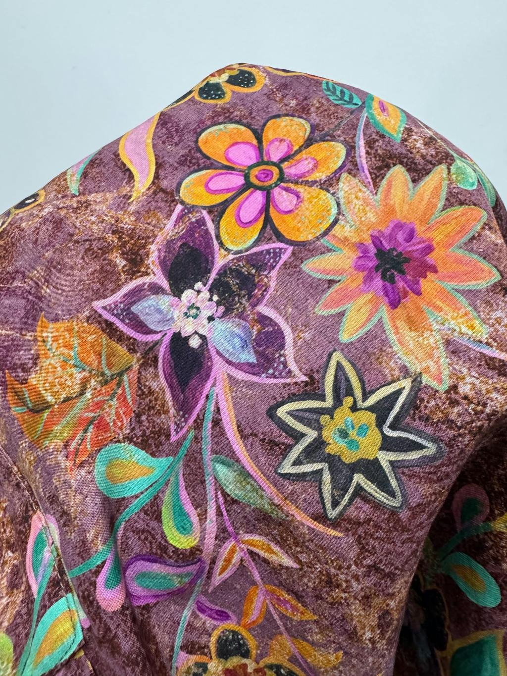 This blouse is so cute with the vibrant colors and fun patterns. The collar stays in place, which is a big plus for me. Definitely my new favorite top!