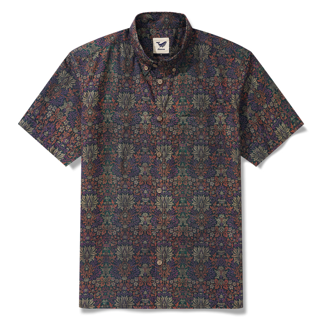 Step into timeless elegance with our Hawaiian-inspired shirt, where vintage charm meets natural beauty. Featuring intricate Morris-inspired patterns in deep, rich tones, this piece exudes a mysterious yet refined aura. Delicate floral and botanical motifs intertwine, capturing the essence of lush gardens in every detail. The meticulous craftsmanship and subdued palette evoke a sense of serene sophistication, making it a statement piece for any occasion. Wear it and carry a piece of a secret, vintage garden with you, exuding unique style with every move.