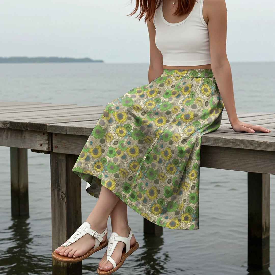 Women Casual Maxi Skirt Long Elastic Waist with Pockets 100% Cotton Green Aloha Earth Day Sunflower Garden Vitality Woven Patch