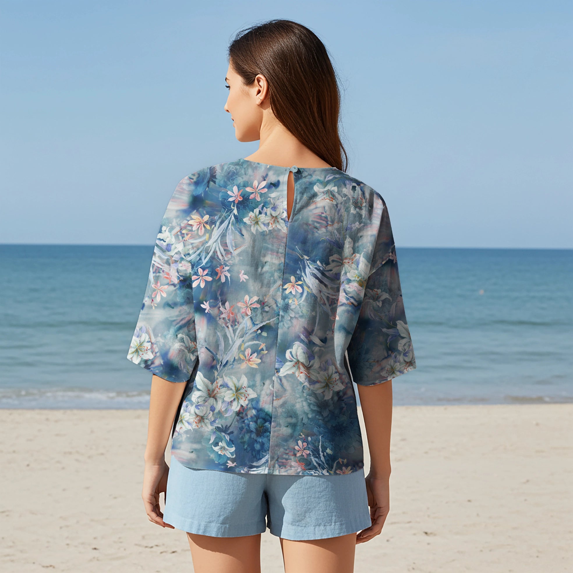 Women Casual Blouse Elbow Sleeve Crew Neck Button-Back 95% Lyocell, 5% Linen Blue Aloha Floral Whispers In The Mist