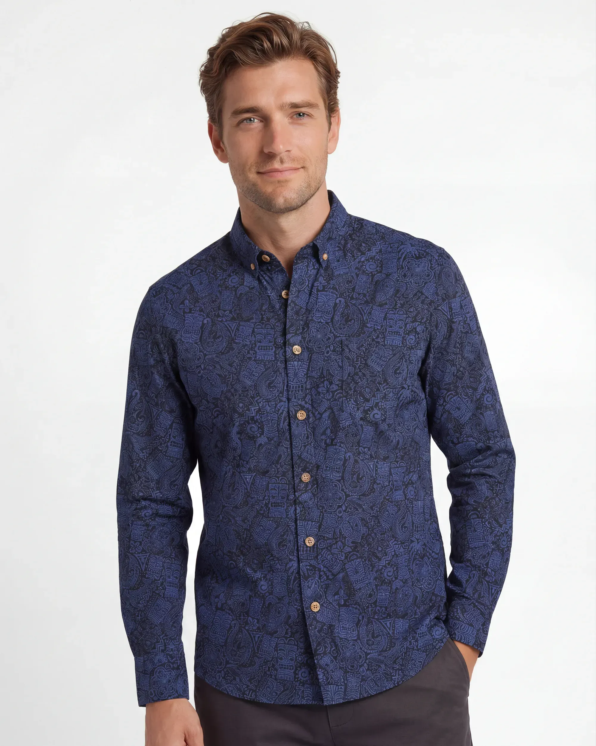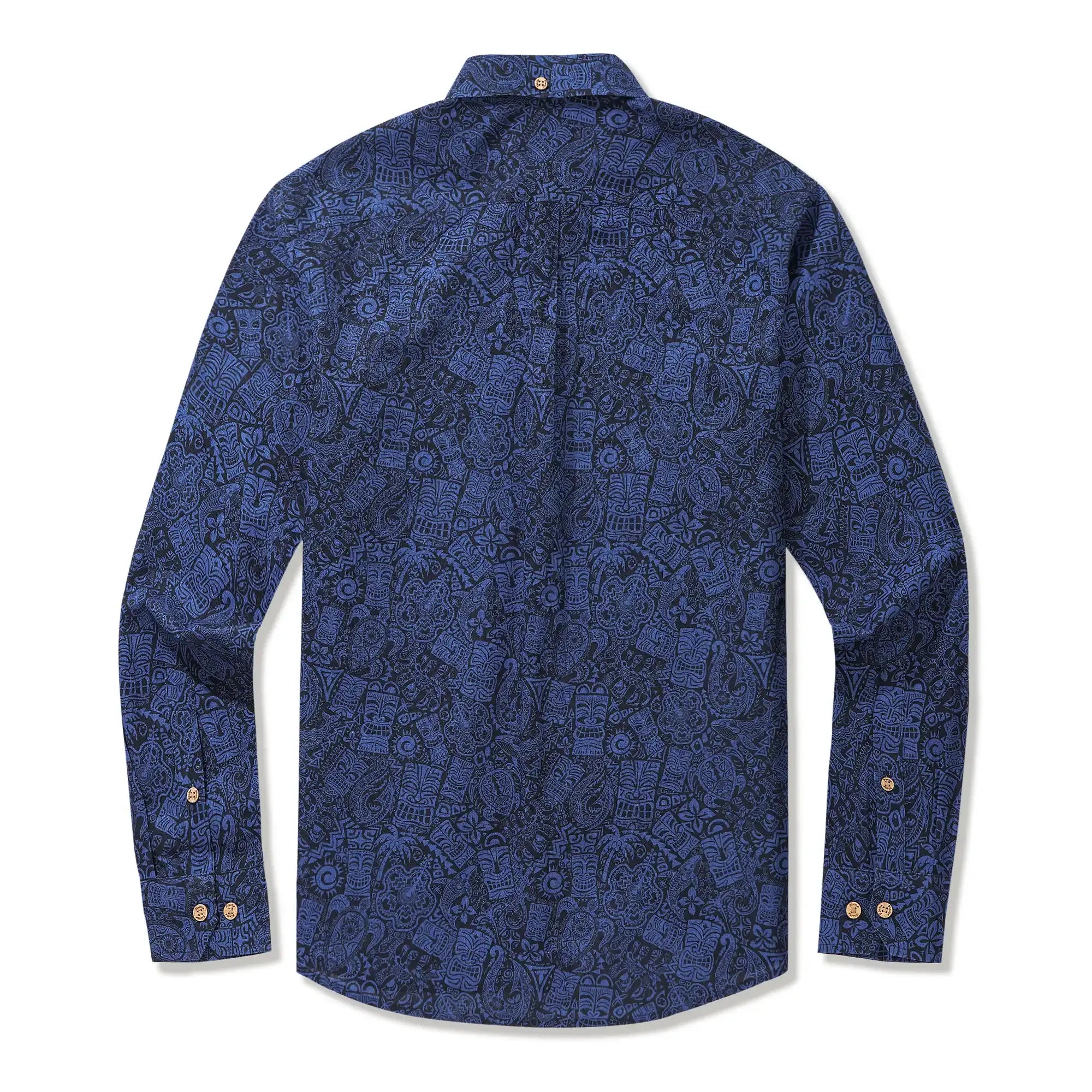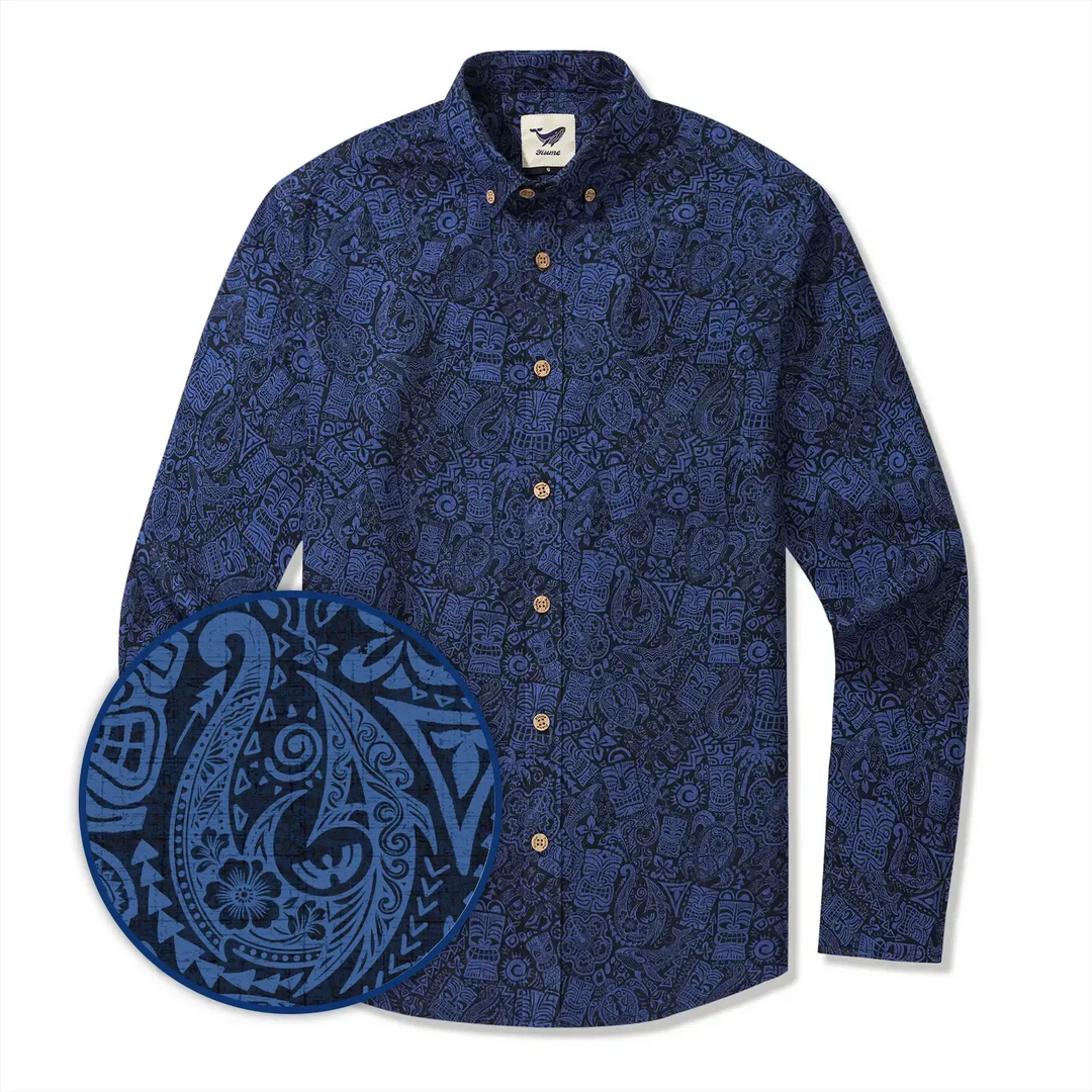 Men's Hawaiian Shirt Long Sleeve Button-down 100% Cotton Blue Aloha Tiki Retro Totem