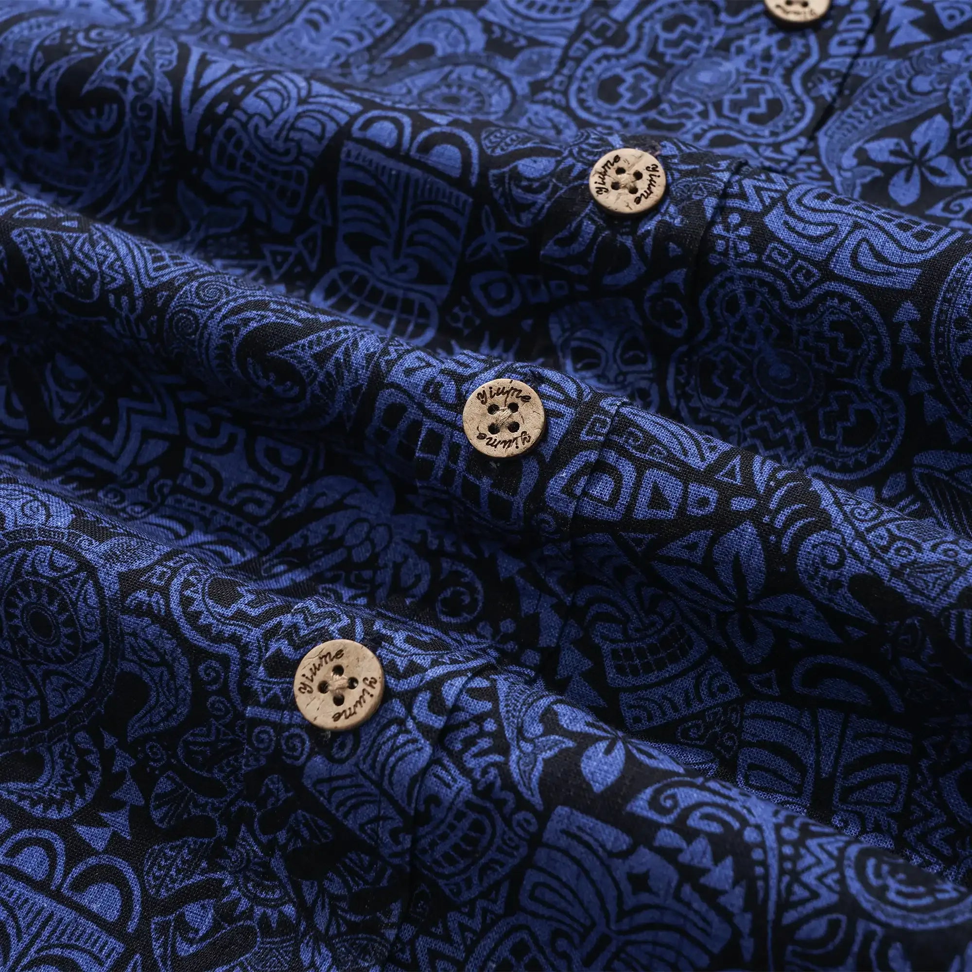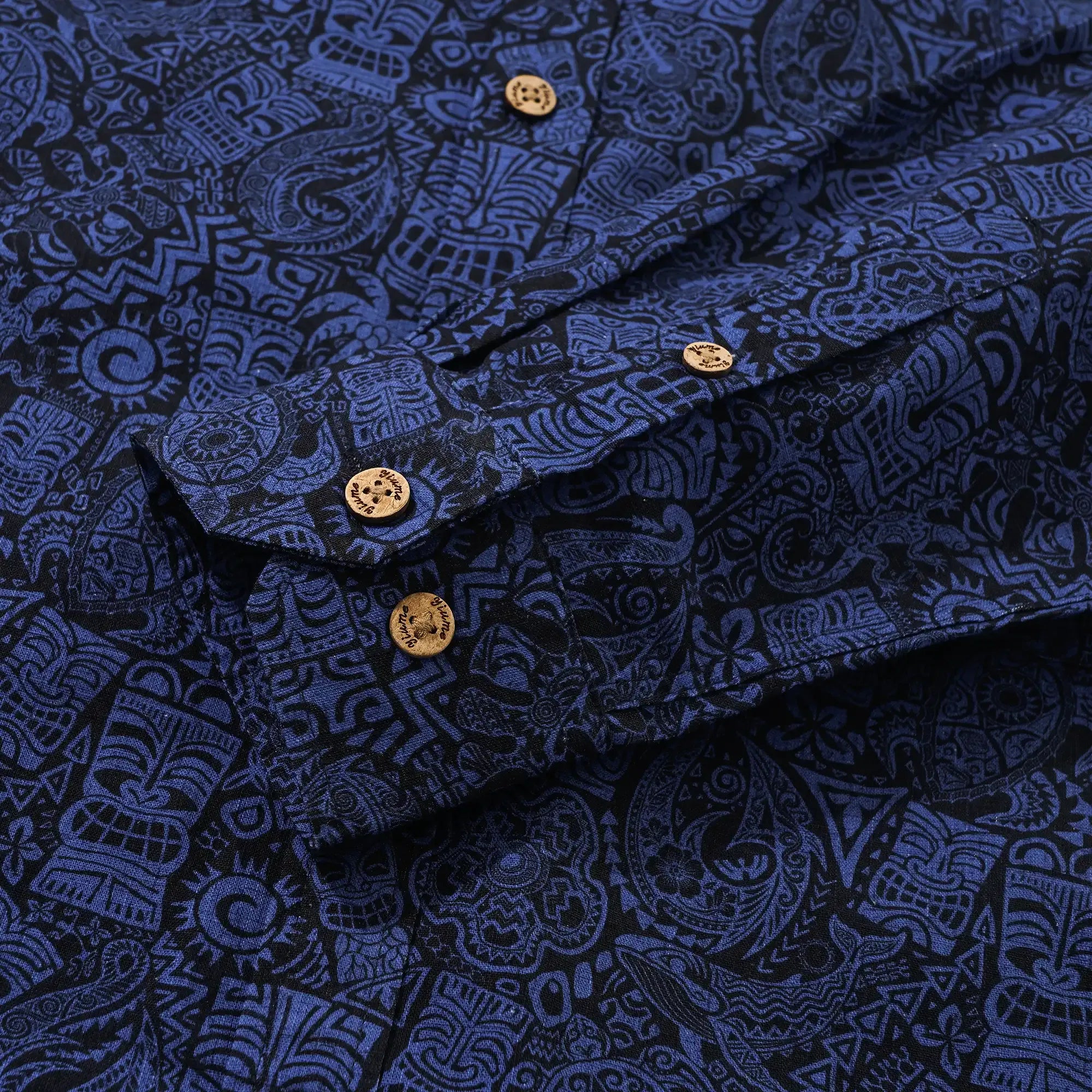 Inspired by classic TIKI tribal culture, our shirt features a blue-black base adorned with exaggerated and lively TIKI totems. Symbols like sea turtles for protection, lizards for vitality, and fish hooks for adventure are intricately woven in, creating a retro "Tiki Gent" look. Embrace the tropical vintage adventure vibe with this unique piece, perfect for breaking away from the ordinary.