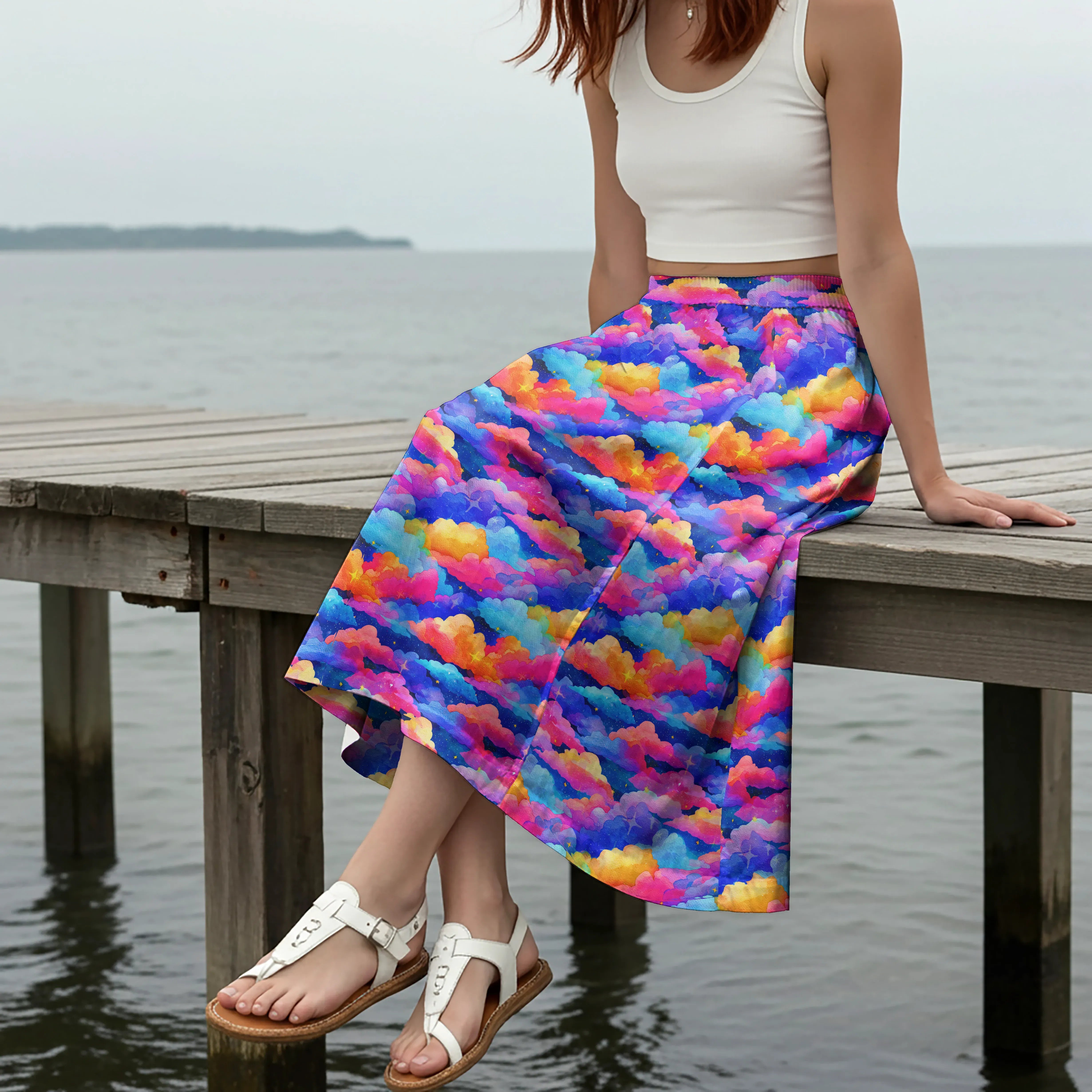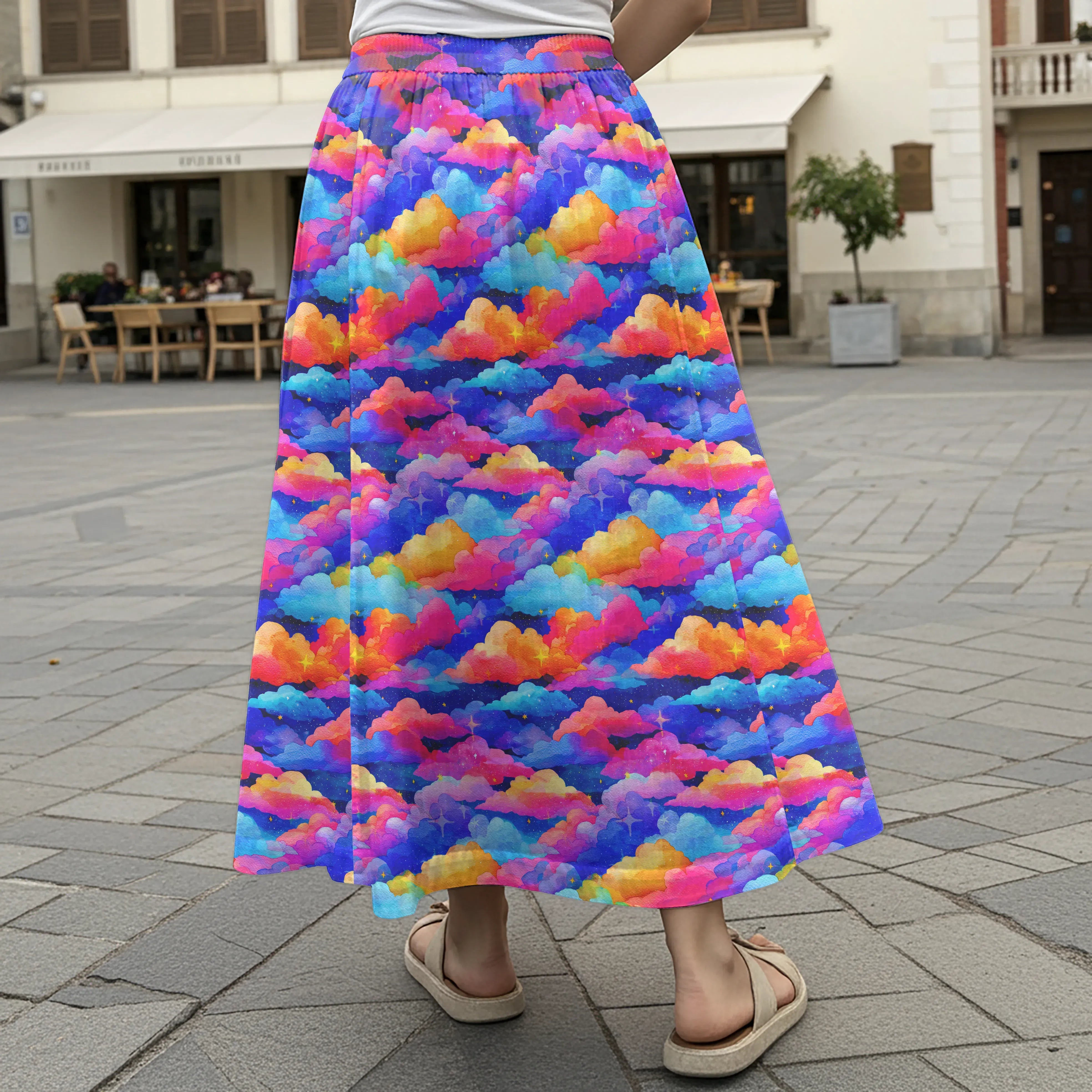 Women Casual Maxi Skirt Long Elastic Waist with Pockets 100% Cotton Orange Aloha Rainbow Clouds Meadow
