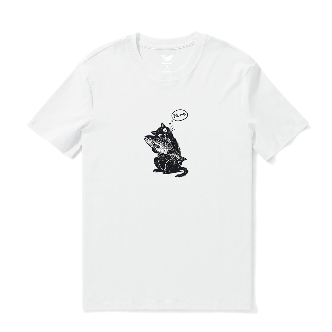 A sleek black cat clutching a plump fish with a satisfied expression. The "It's me" speech bubble adds a playful touch. The black and white print exudes a 1920s art deco vibe, blending vintage charm with feline whimsy. Perfect for those who appreciate retro styles and playful humor.