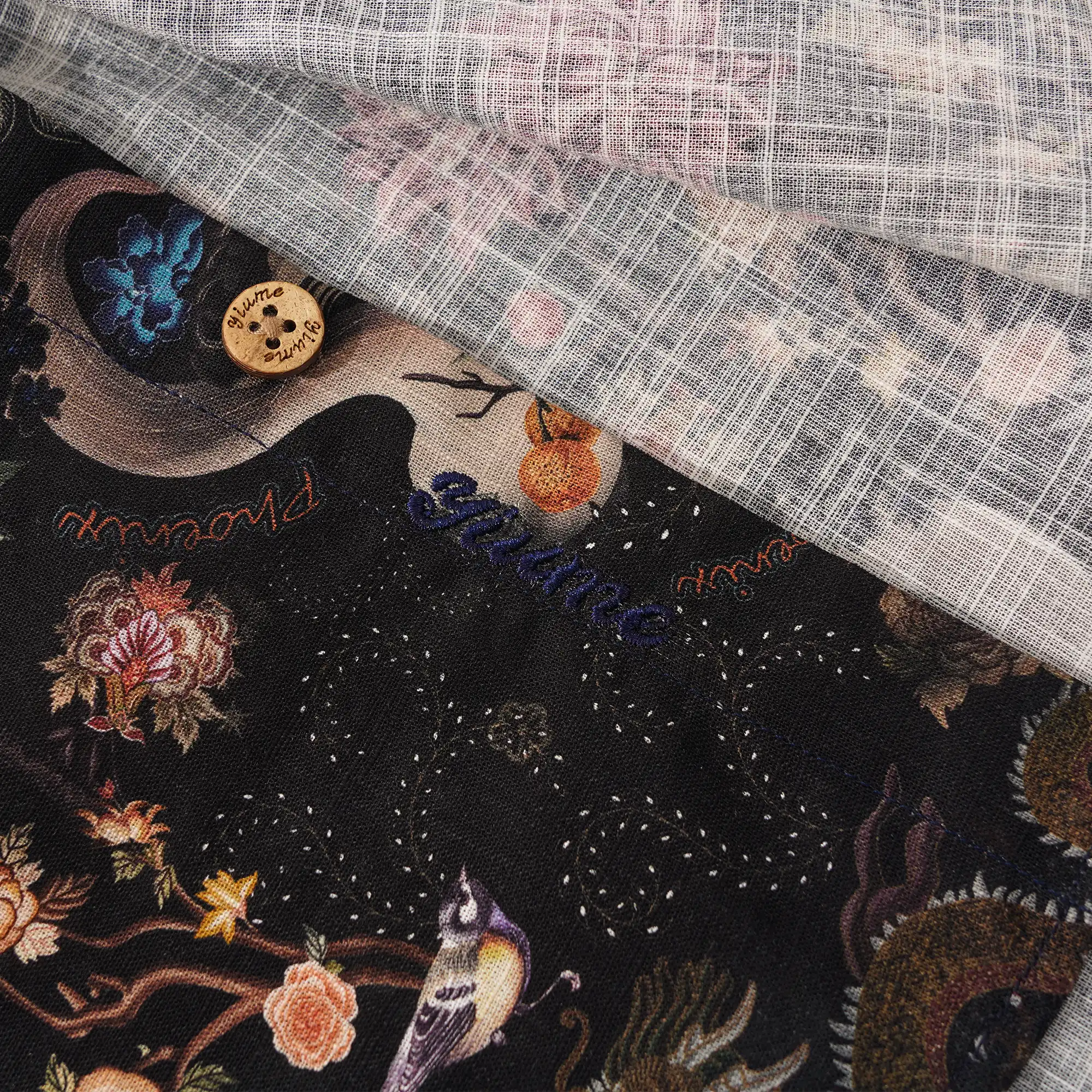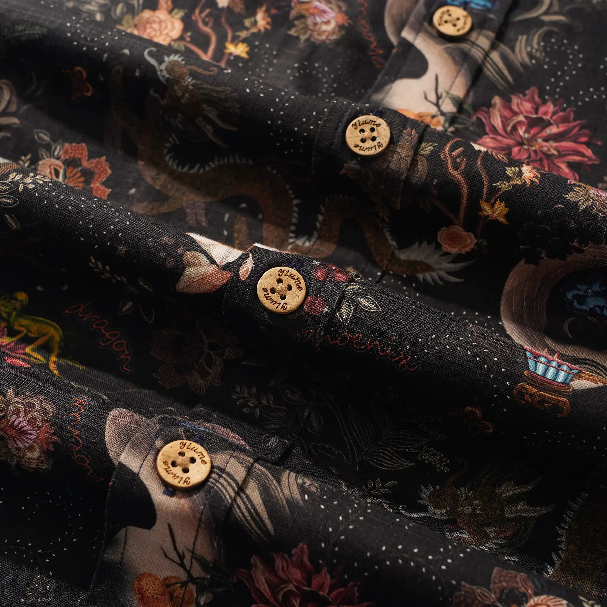 Men's Hawaiian Shirt Long Sleeve Button-down 100% Cotton Black Aloha Ink Charm Eastern Dream