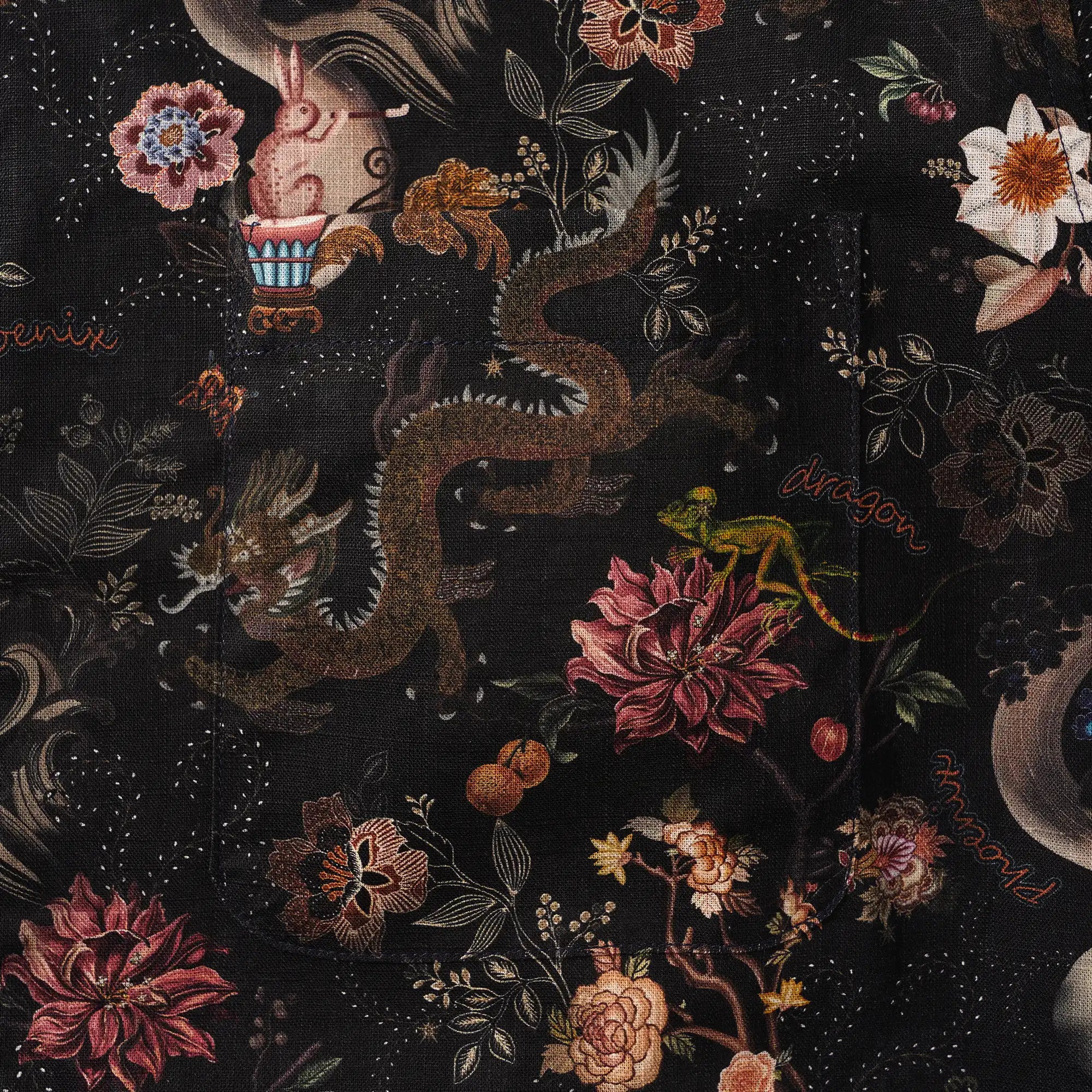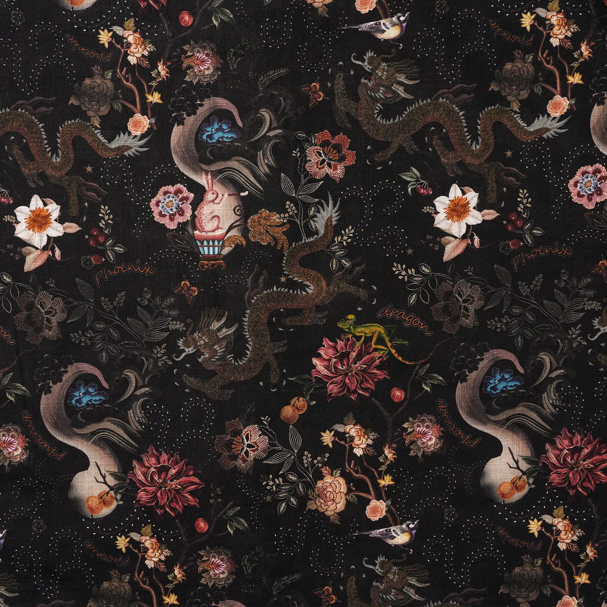 Embrace the allure of the night sky with this design featuring a majestic dragon, symbolizing power and grace in Chinese culture. Intricate scales and vibrant floral hues on a deep black backdrop evoke an enchanting Eastern ambiance of ancient tales.