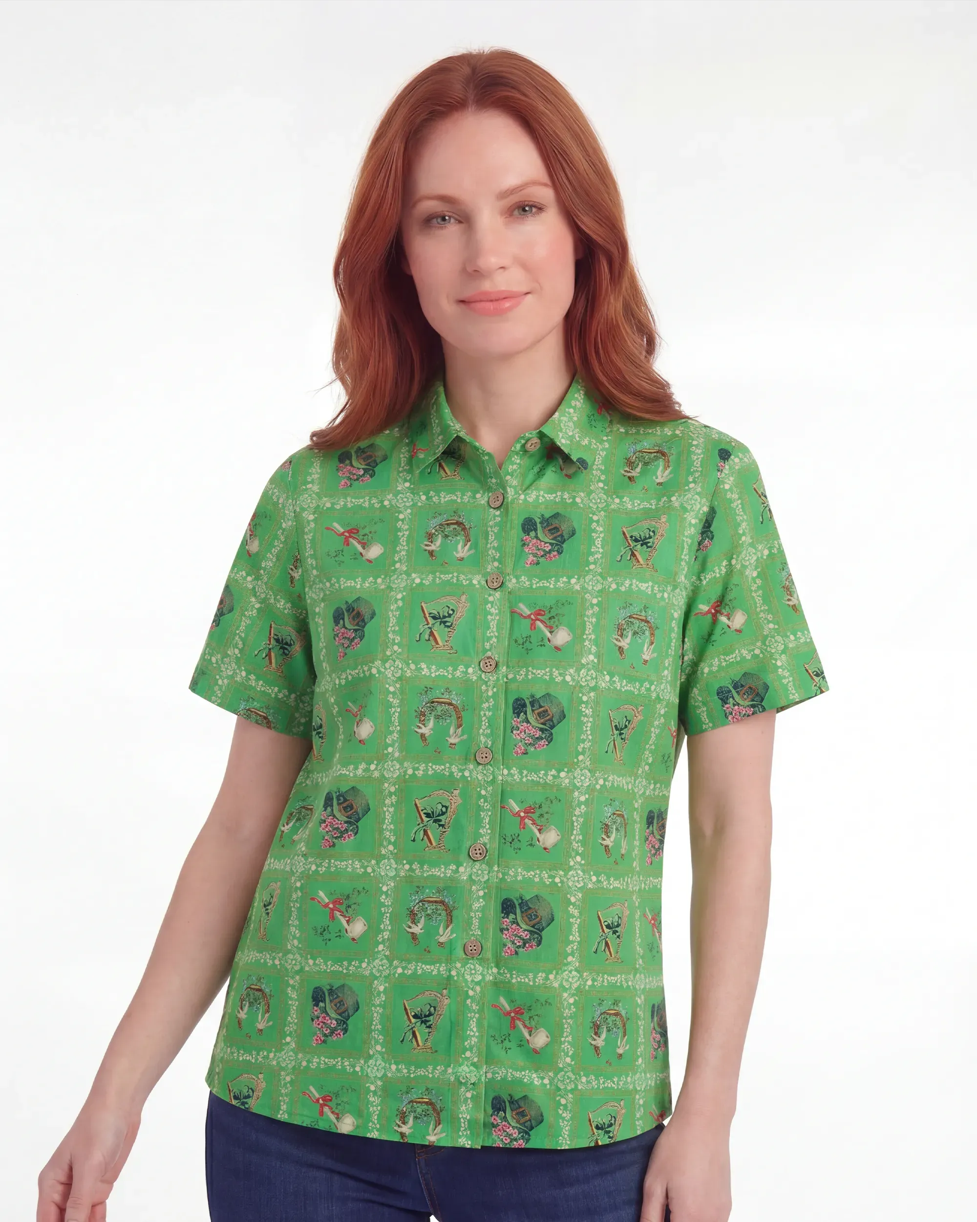 This shirt captures the spirit of Irish luck in rich emerald green, with every check alive with symbols of fortune — playful green hats adorned with pink blossoms, lyrical harps of charm, doves with floral wreaths of peace, and red ribbons with silver shovels carrying hidden blessings. Each print tells a tale of Irish folklore, blending exotic artistry with effortless style. Perfect for daily wear or festive gatherings, it lets you stand out and wear your luck with timeless flair.