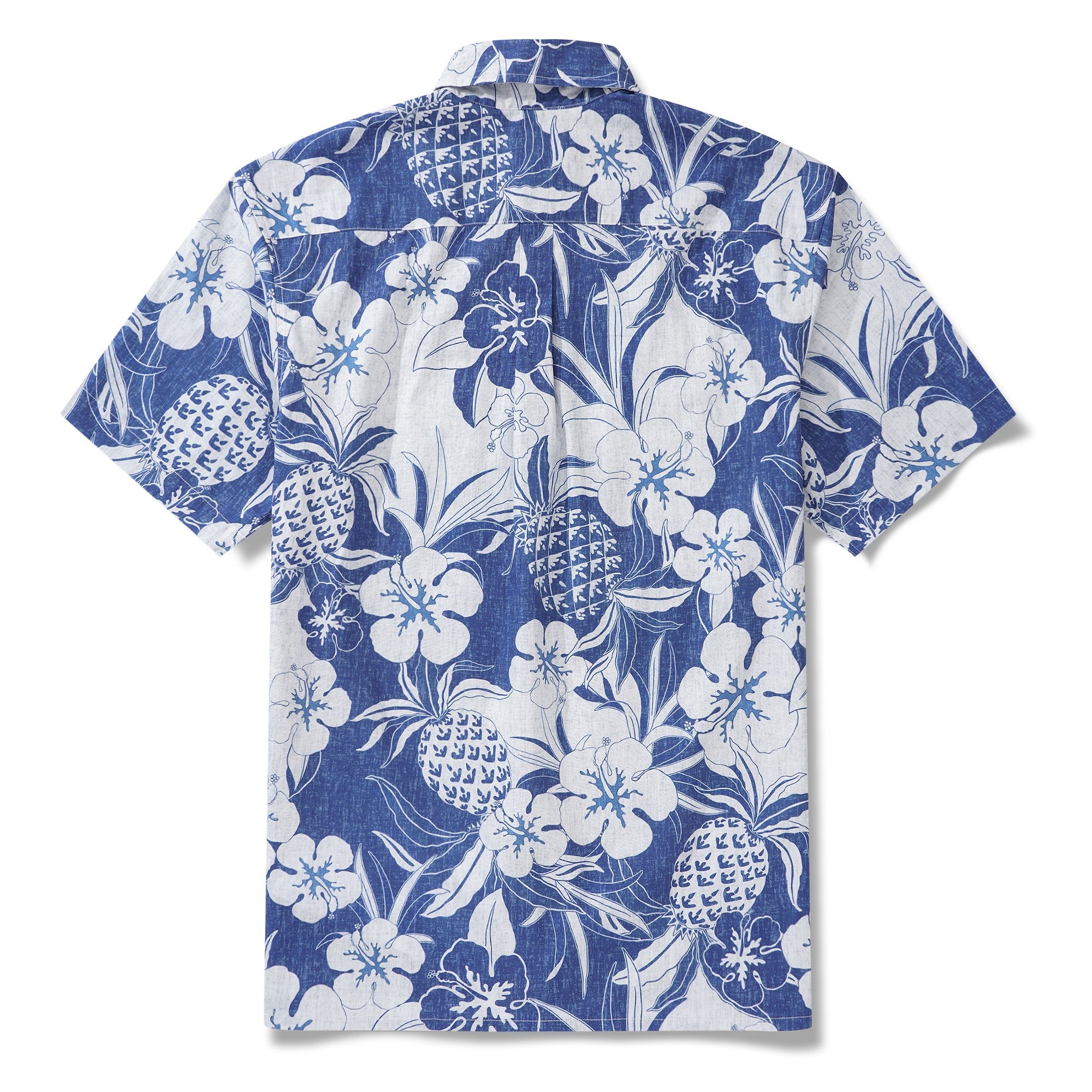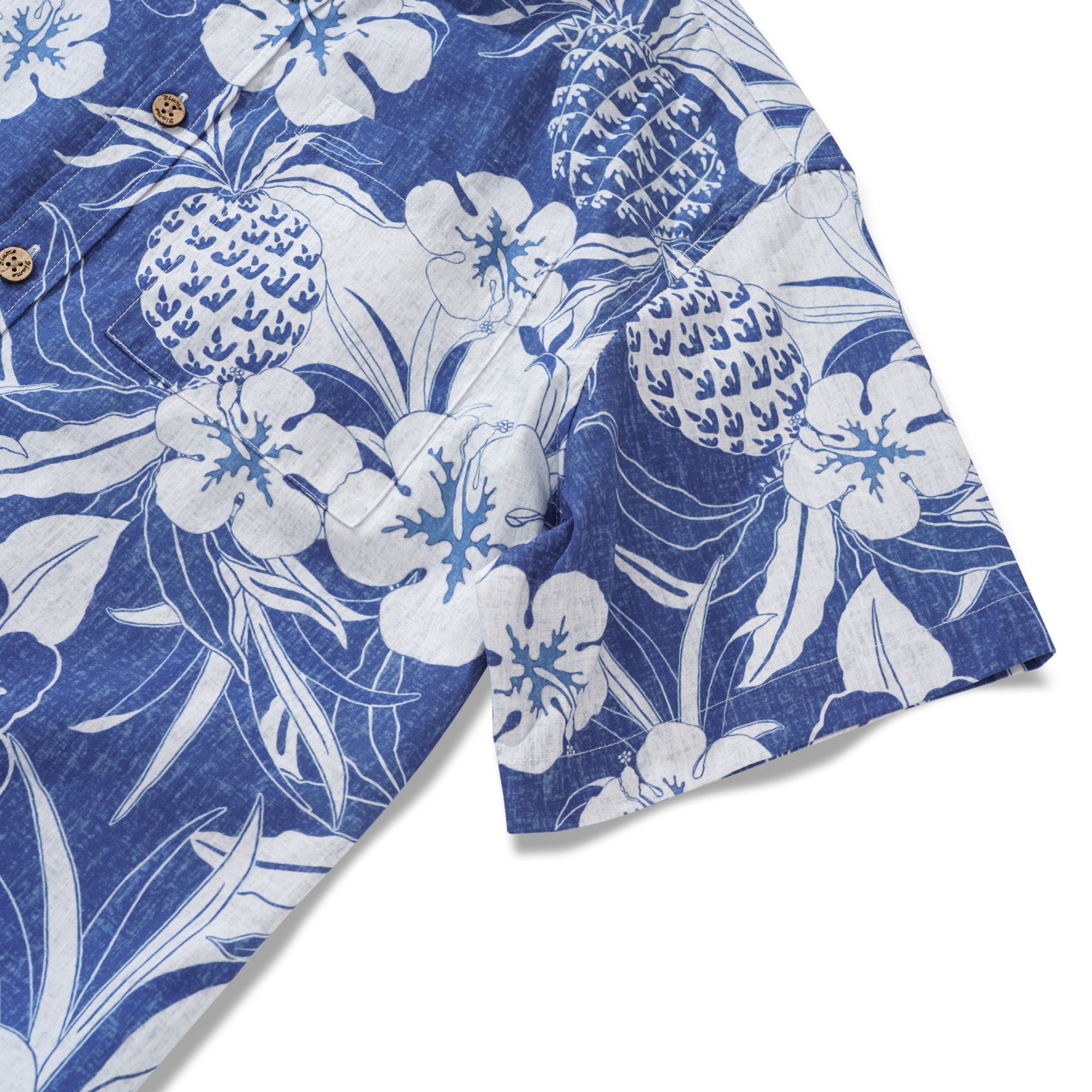 In this design, the symbol of hospitality in Hawaiian culture, the pineapple, intertwines with the beautiful and joyful hibiscus flower. The combination of blue and white, along with the vintage textured feel, evokes a sense of old-world charm. When you wear it, you effortlessly embody the relaxed tropical vibe. Whether strolling through the streets or heading to a vacation destination, you can fully embrace your own Hawaiian style!