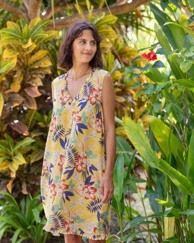 - The neckline and hem are adorned with ruffle trim
