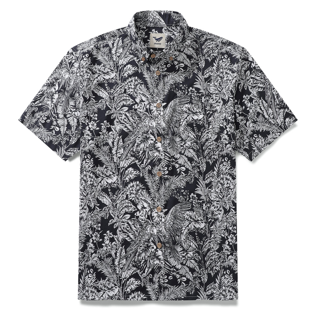 Men's Hawaiian Shirt Black Parrot In The Jungle 100% Cotton Button Down