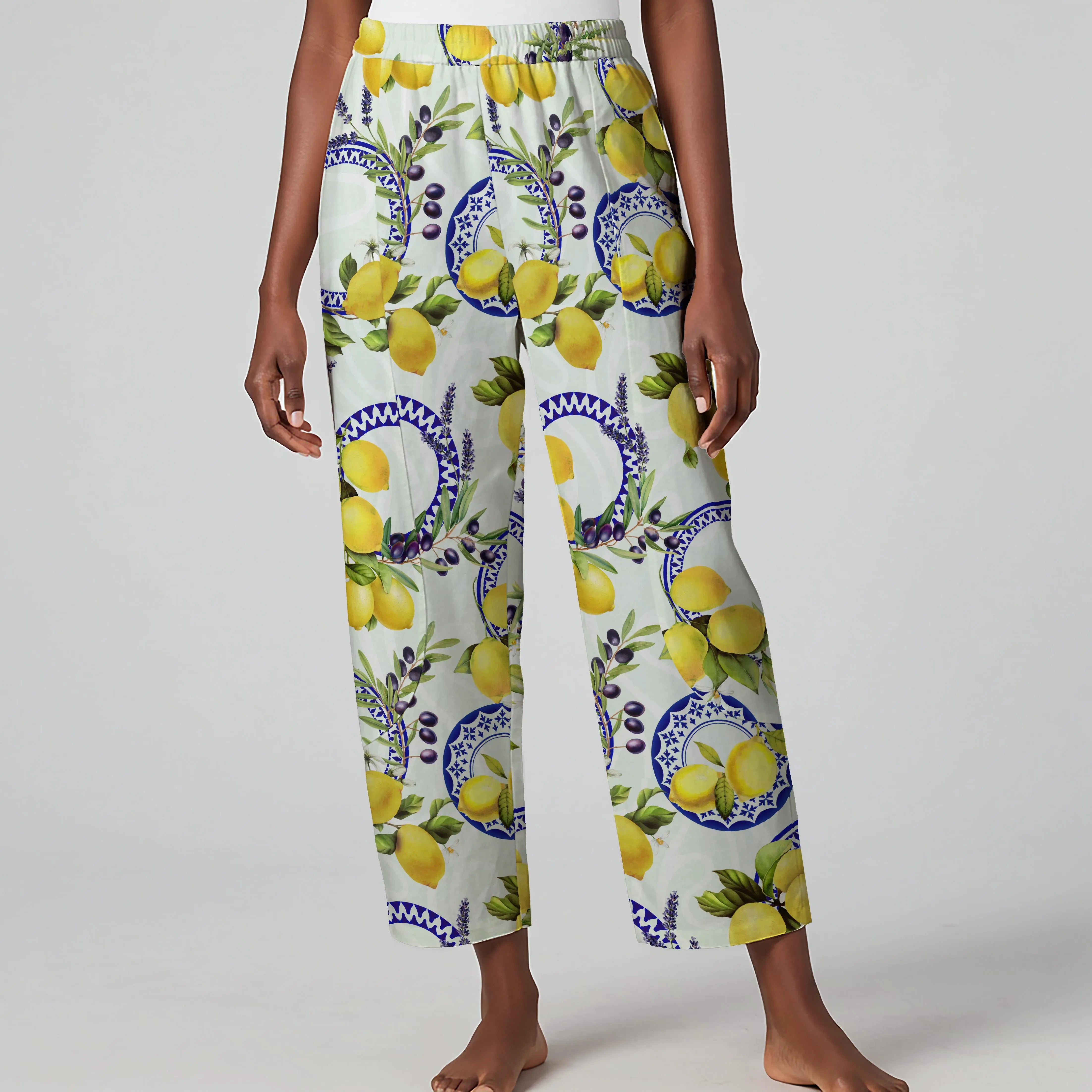 Women Casual Ankle Pants Lounge Elastic Waist with Pockets 93% Lyocell, 7% Linen Purple Aloha Lemon, Olive, And Lavender Harmony Symphony