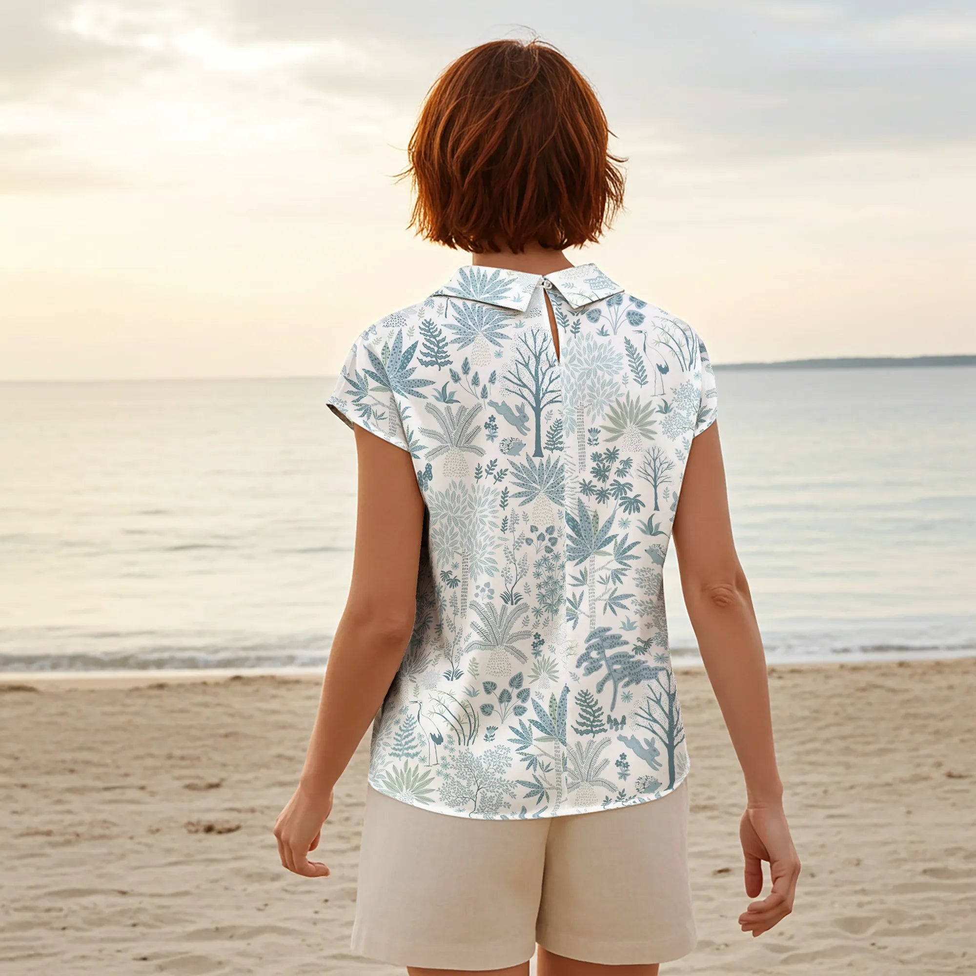 Women Casual Blouse Cap Sleeve Fold-Over Neck Button-Back 100% Lyocell Blue Aloha Whispering Forest Tales