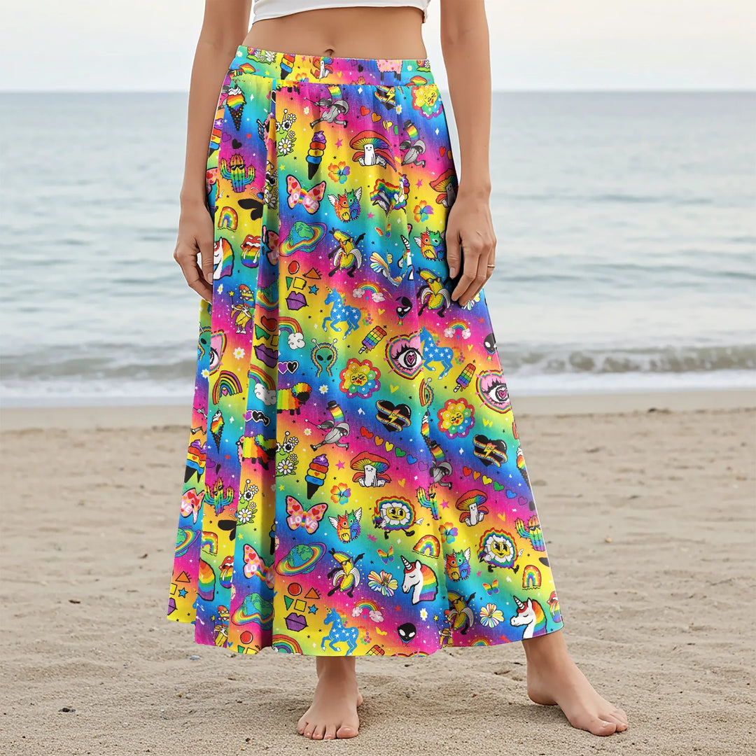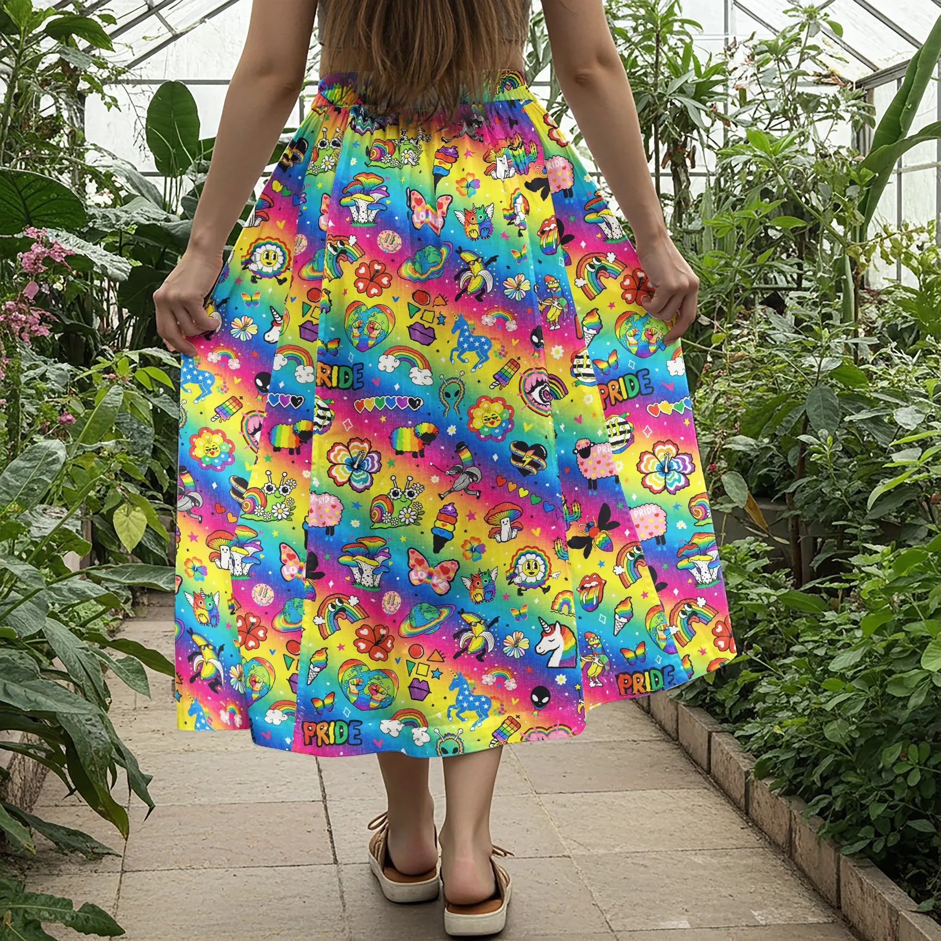 Women Casual Maxi Skirt Long Elastic Waist with Pockets 100% Cotton Aloha Rainbow Pride Delight