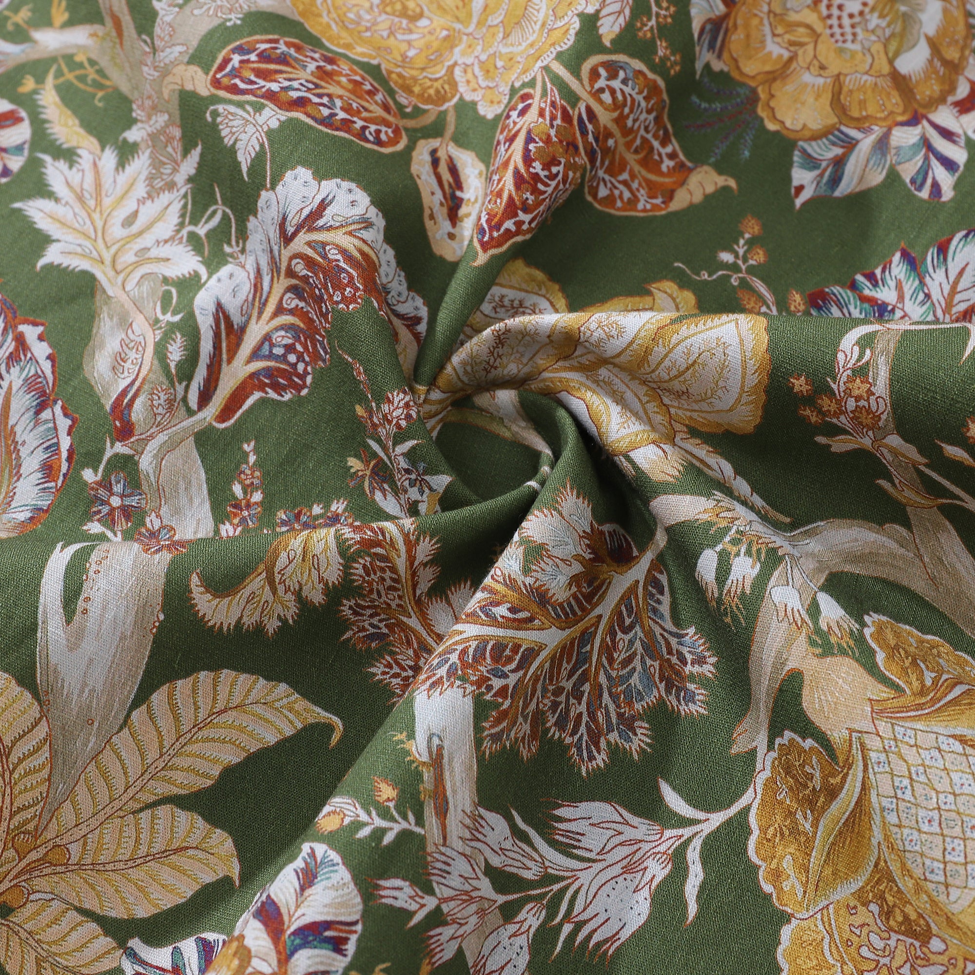 This chintz print showcases a variety of flowers in a harmonious analog color scheme, blending intricate details of blooms and foliage into a seamless and elegant botanical pattern.
