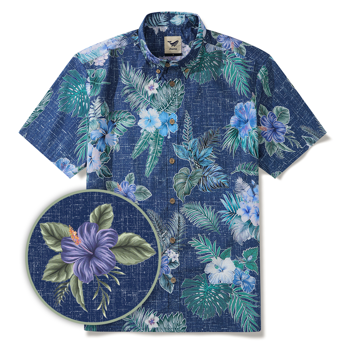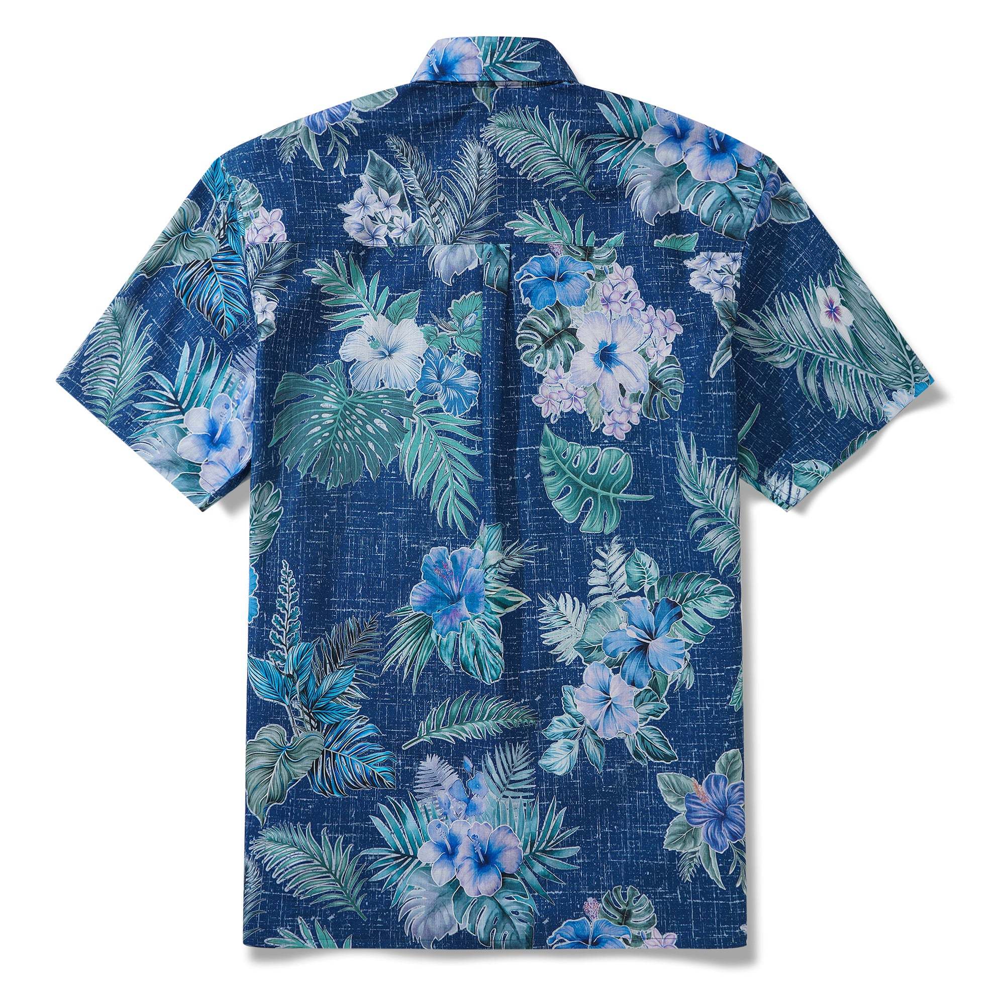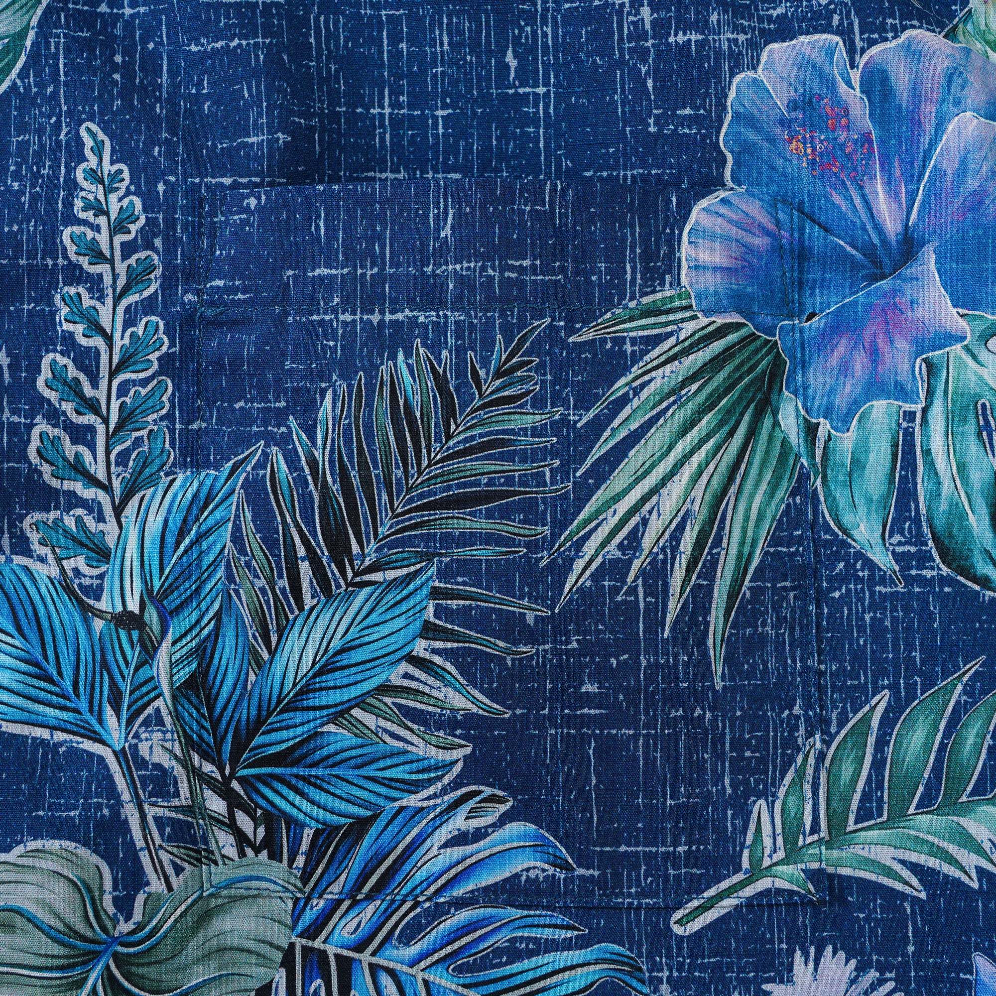 Transport yourself to the captivating beauty of Hawaii with this exquisite shirt featuring the iconic hibiscus flower as its centerpiece. The artistic rendering of the flower in a refreshing and subtle blue hue, complemented by the irregular white outlines, creates a unique rhythmic interplay of colors and lines. The vibrant green palm leaves alongside the hibiscus flowers beautifully contrast each other, capturing the dynamic essence of tropical island life. Set against a deep blue background with a mottled effect, this shirt embodies the essence of Hawaii – blending sunlight and sea breeze into a mysterious and alluring piece of art that exudes island charm and artistic flair. Elevate your wardrobe with this masterpiece that showcases the essence of Hawaiian paradise.