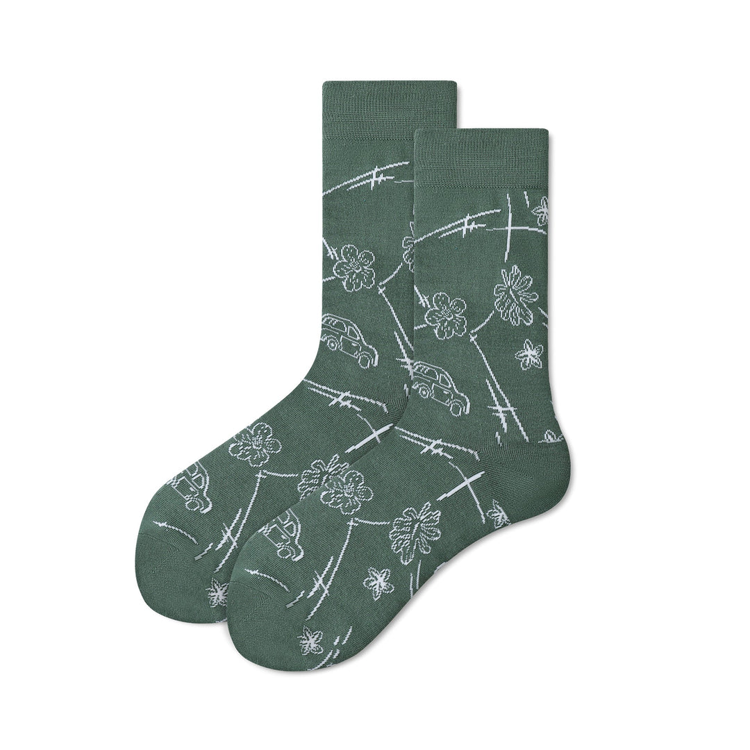 Vintage Car And Hibiscus Tropical Print Green Socks