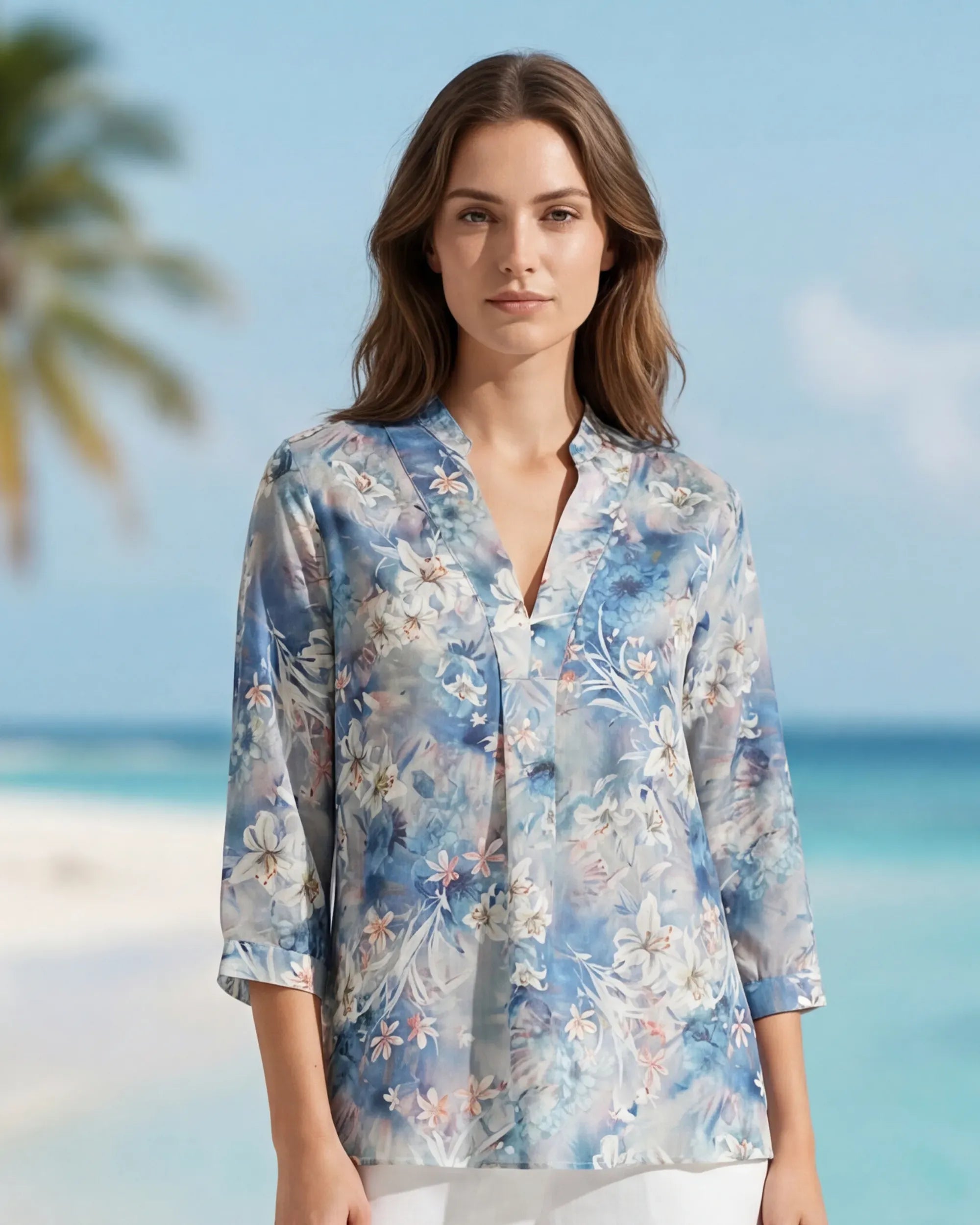 This blouse is so cute with the vibrant colors and fun patterns. The collar stays in place, which is a big plus for me. Definitely my new favorite top!
