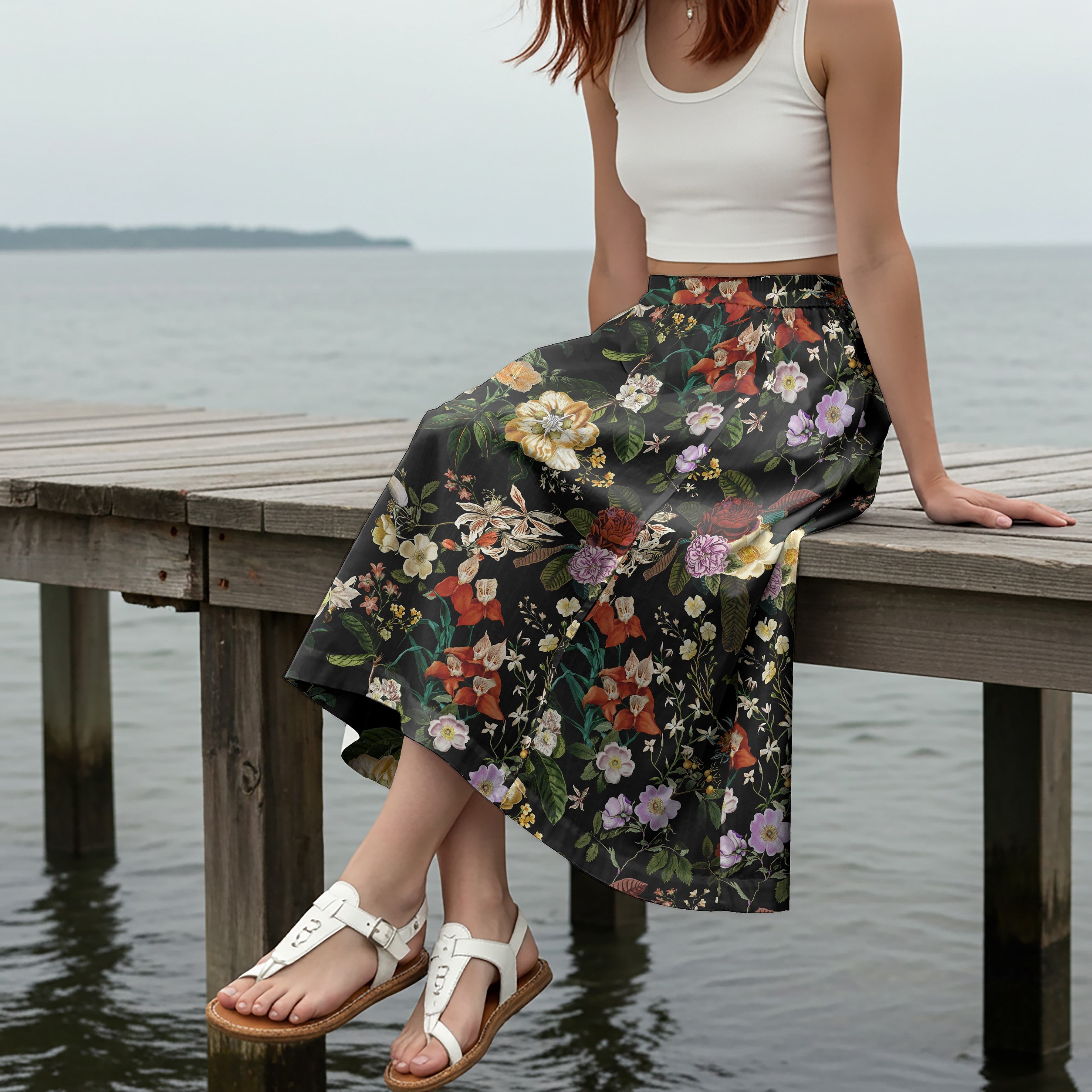 Women Casual Maxi Skirt Long Elastic Waist with Pockets 100% Cotton Black Aloha Night Banquet Blossoms