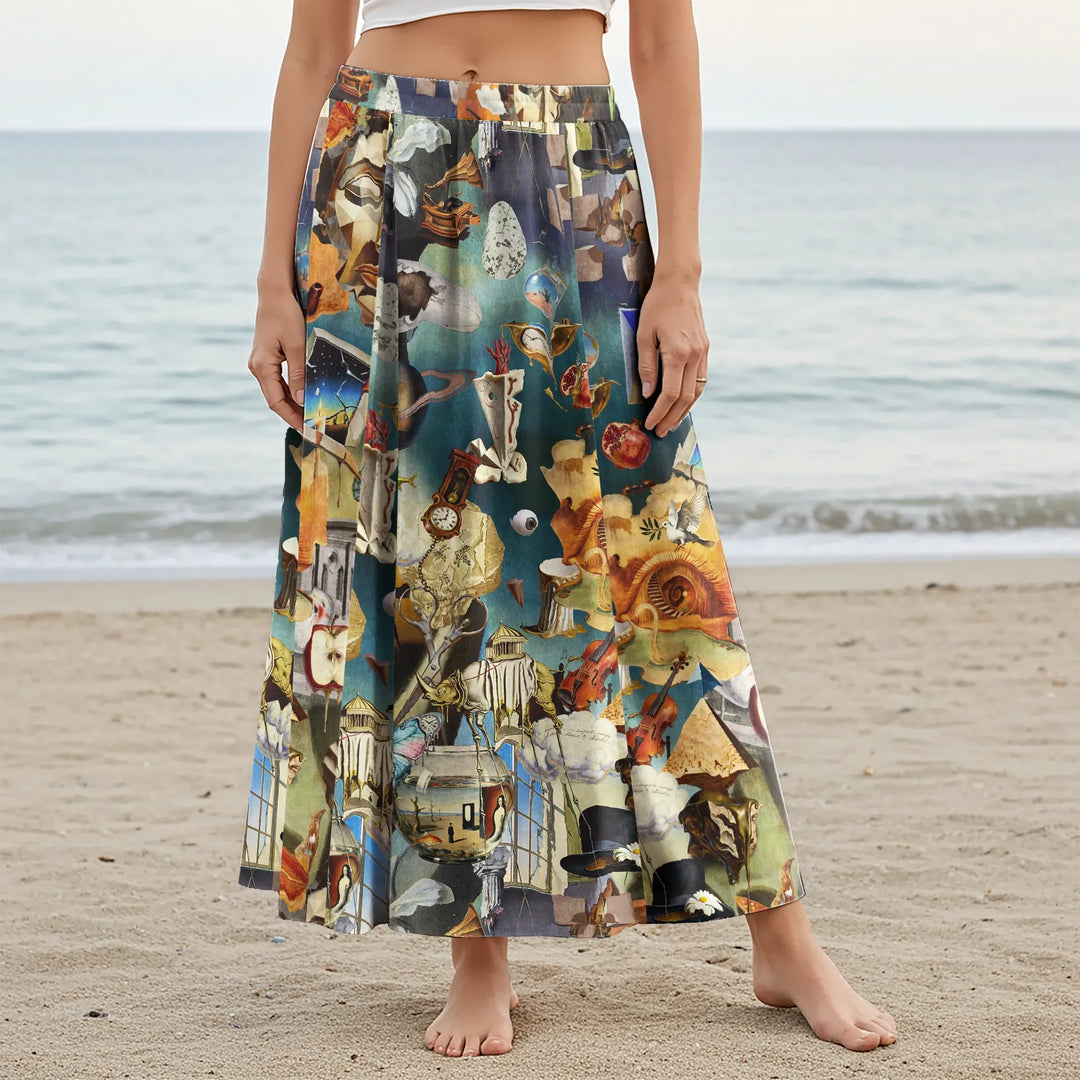 Women Casual Maxi Skirt Long Elastic Waist with Pockets 100% Cotton Blue Aloha Hyperreal Dreamscapes Art