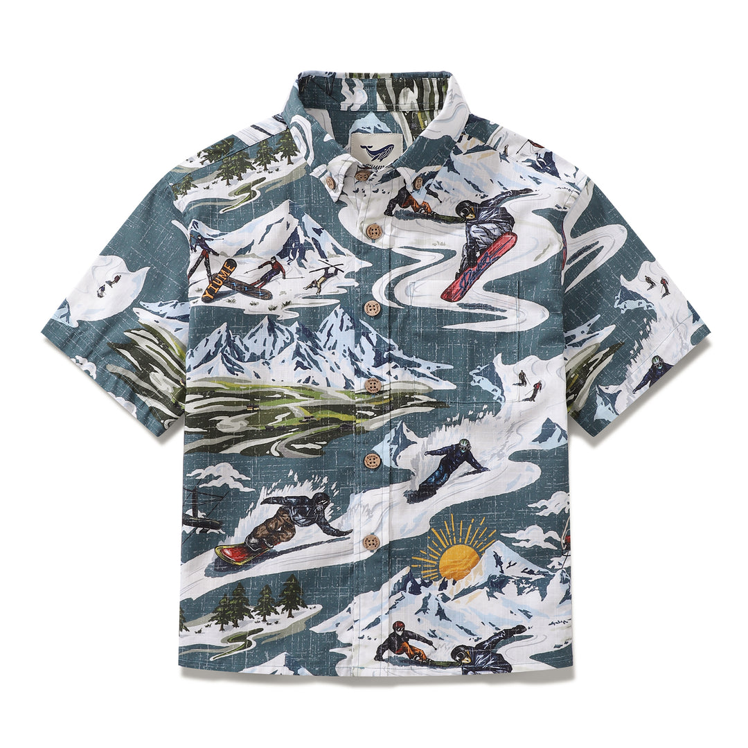 Children's Hawaiian Shirt Extreme Sports Series 2: Mountain Skiing Print Cotton Button-down Short Sleeve