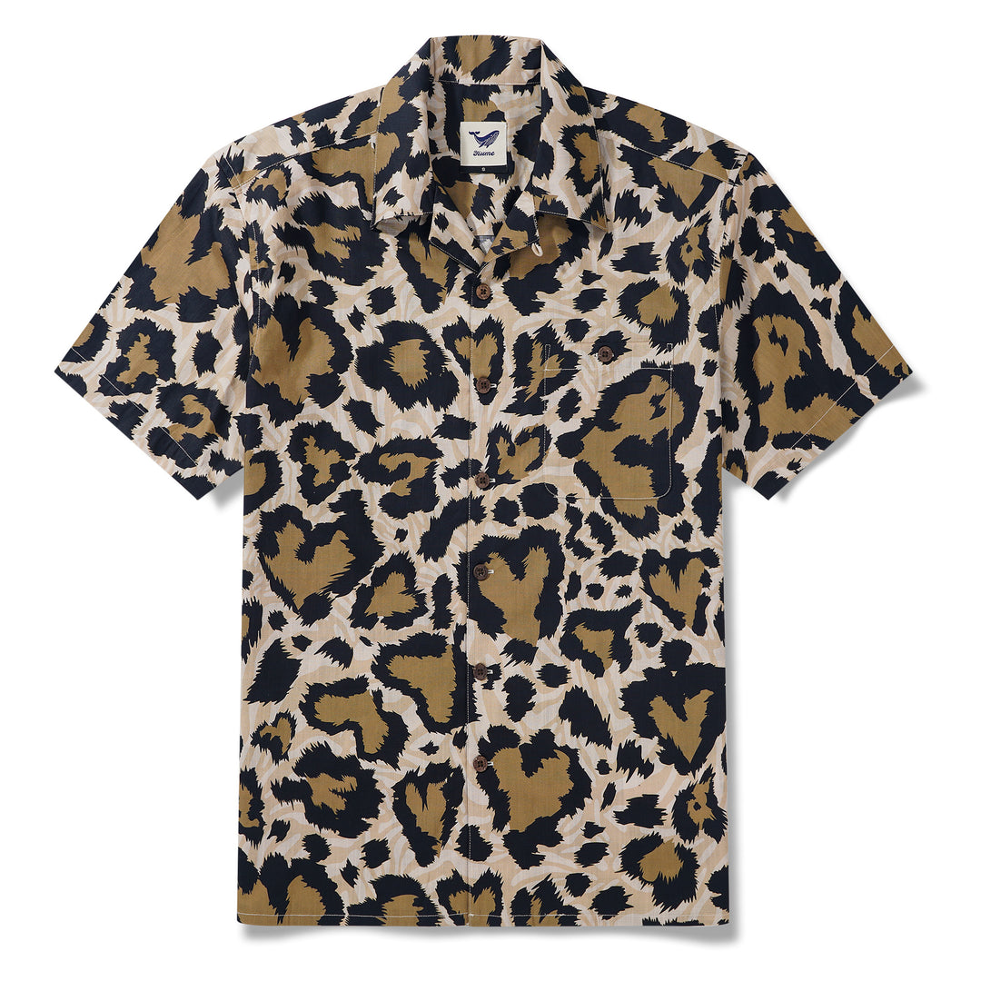 Men's Hawaiian Shirt Short Sleeve Camp Collar 100% Cotton Black Aloha Leopard Wilderness Whisper Leopard Print