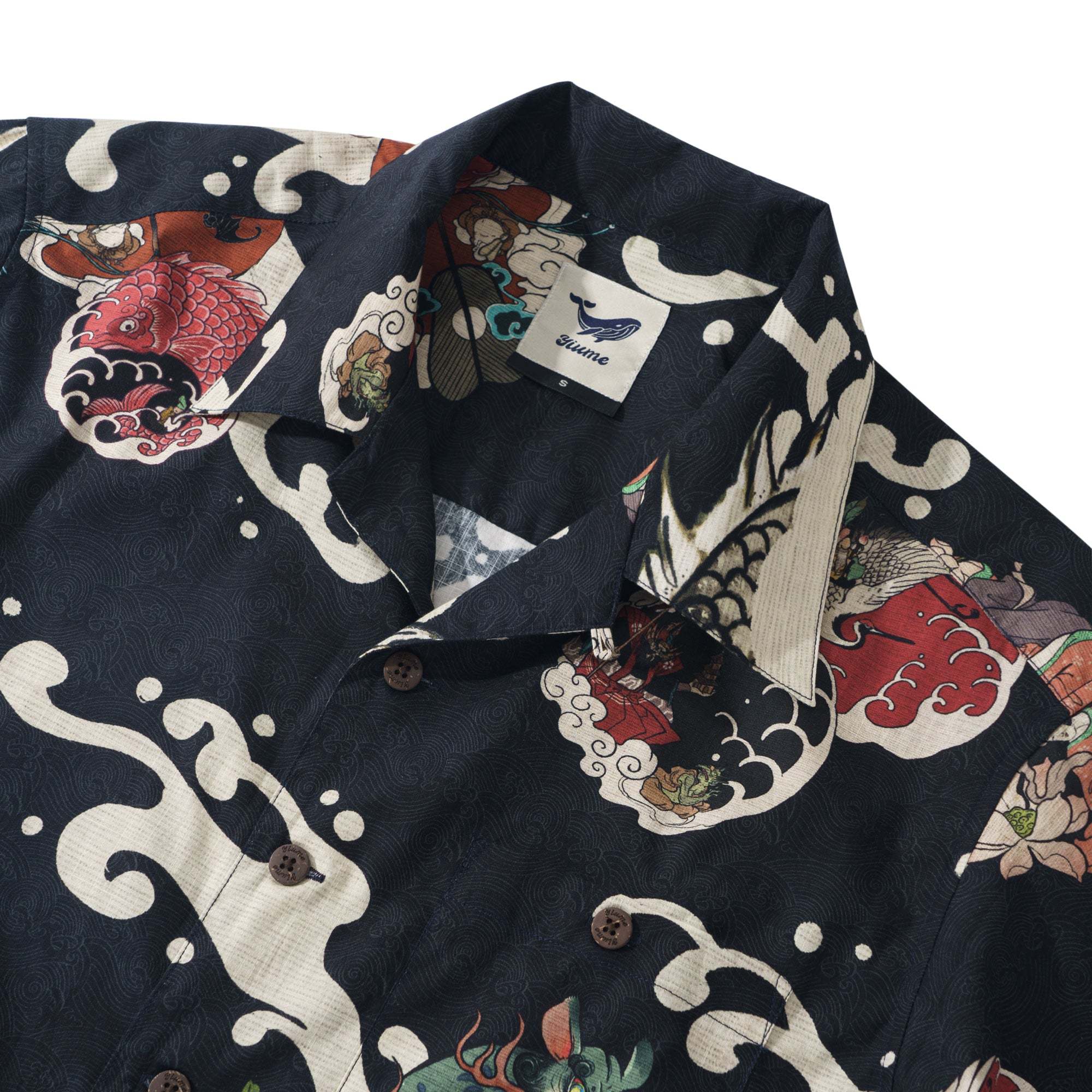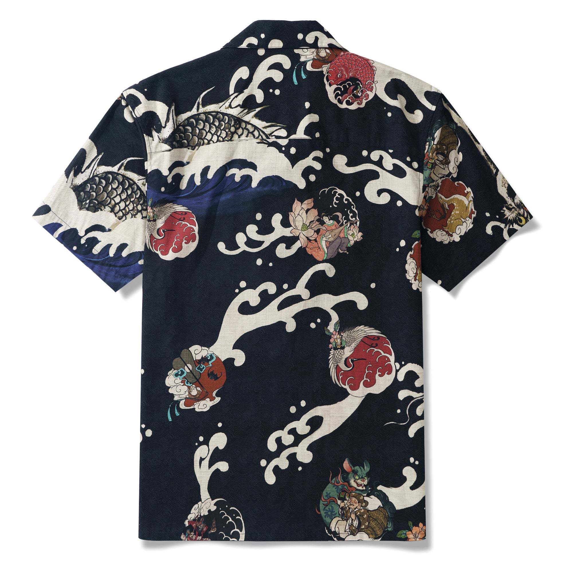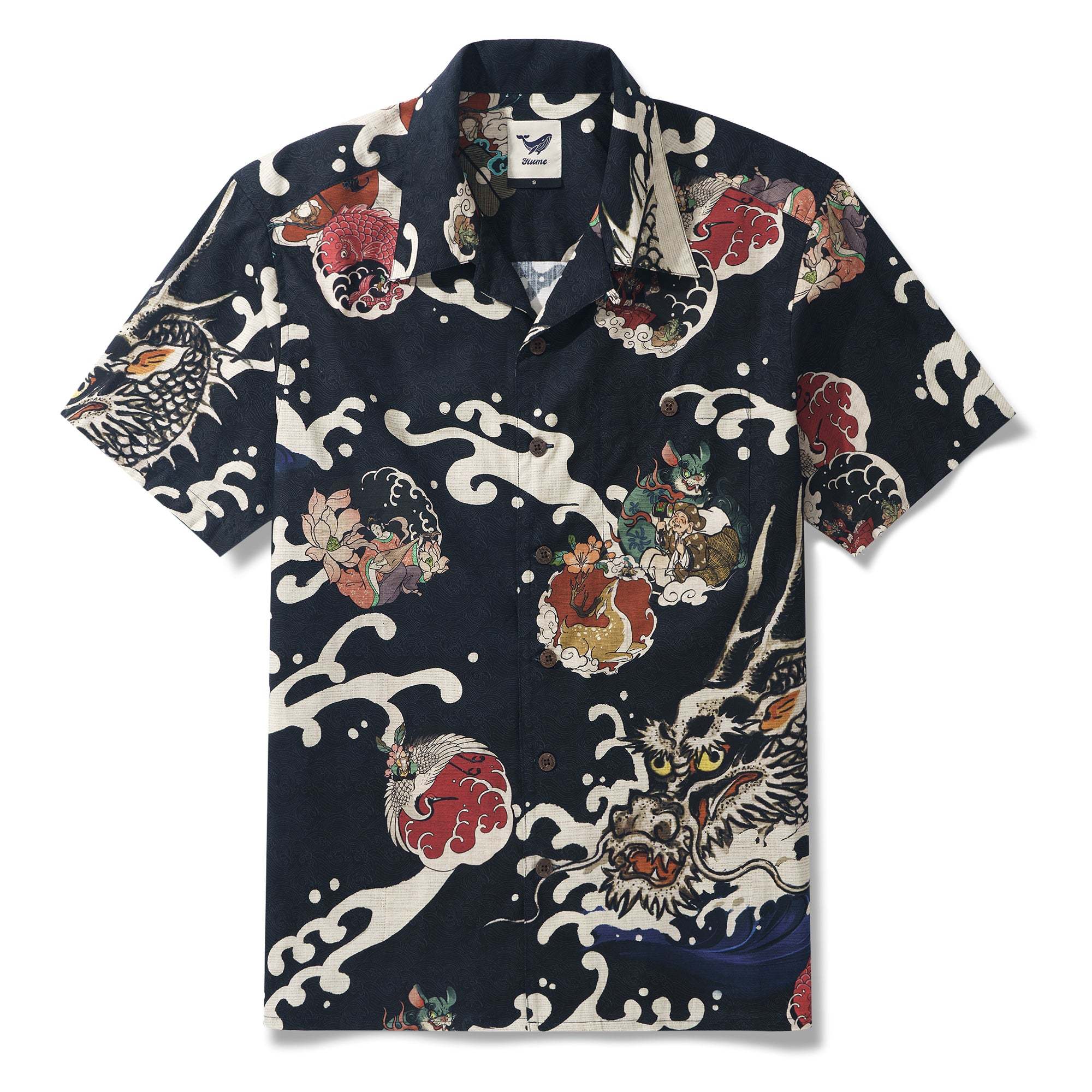 100% Cotton Men's Aloha Shirt Japanese Hawaiian Shirt Short Sleeve Camp Collar Shirt Seven Fortunes Charm Collection