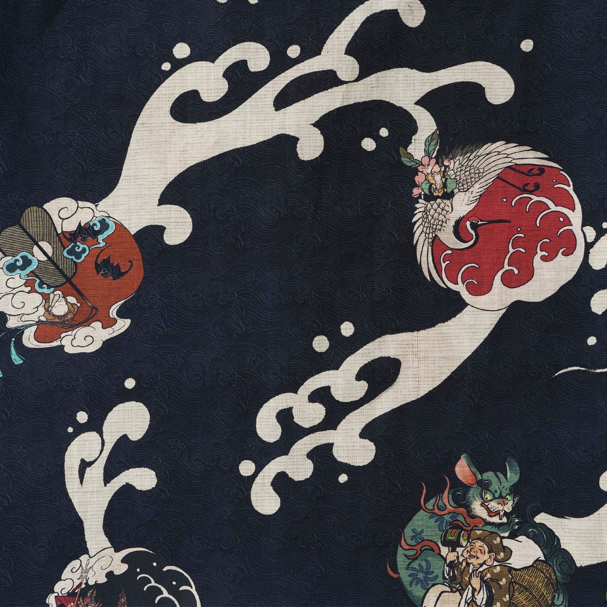 The Seven Lucky Gods of Japan are widely revered in folklore. Each of the seven circular patterns in the design represents a different deity.