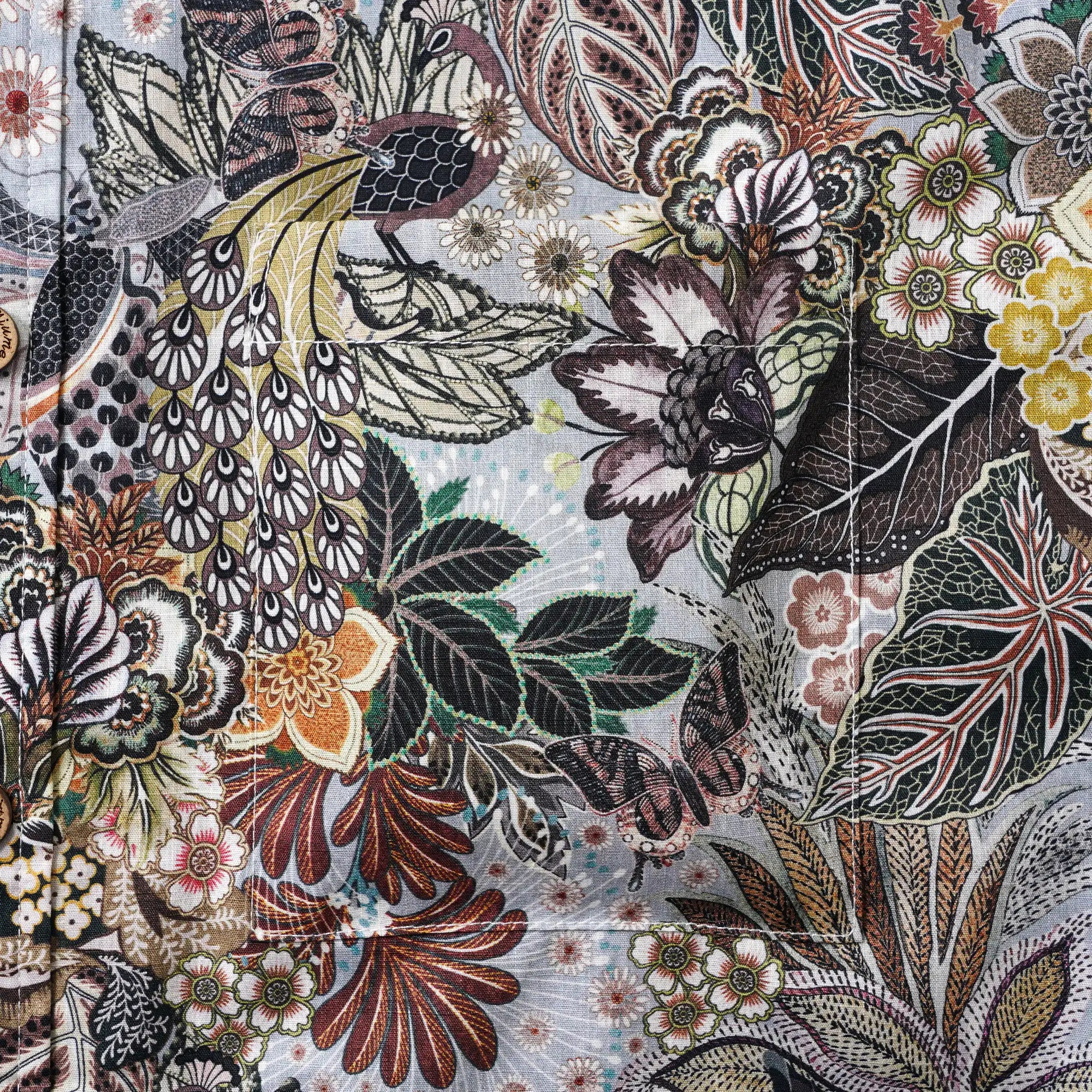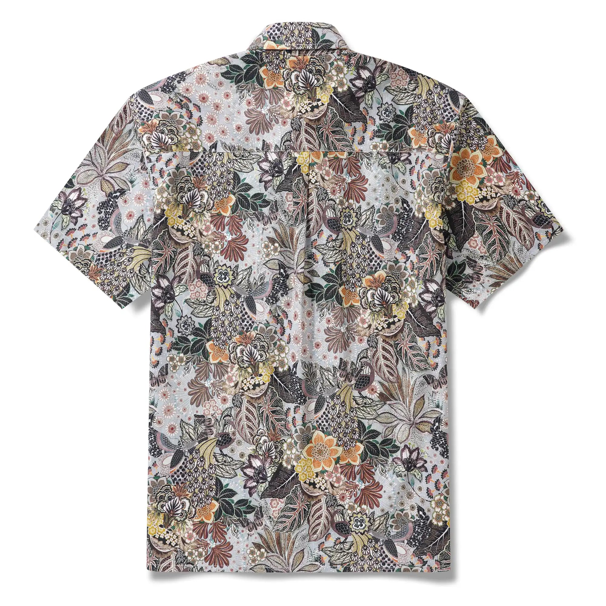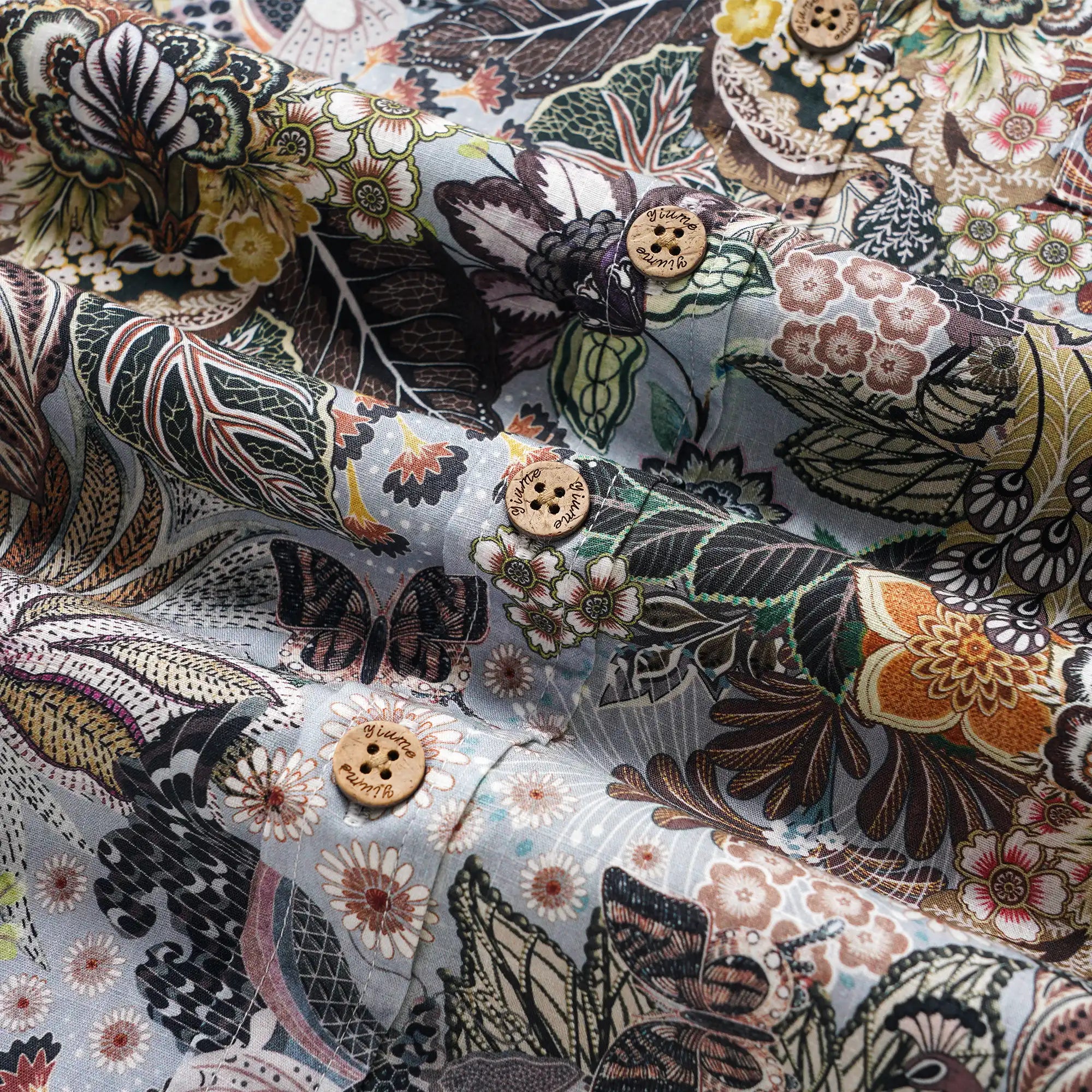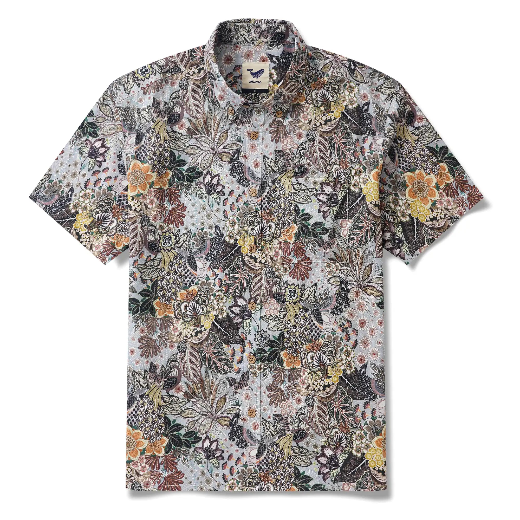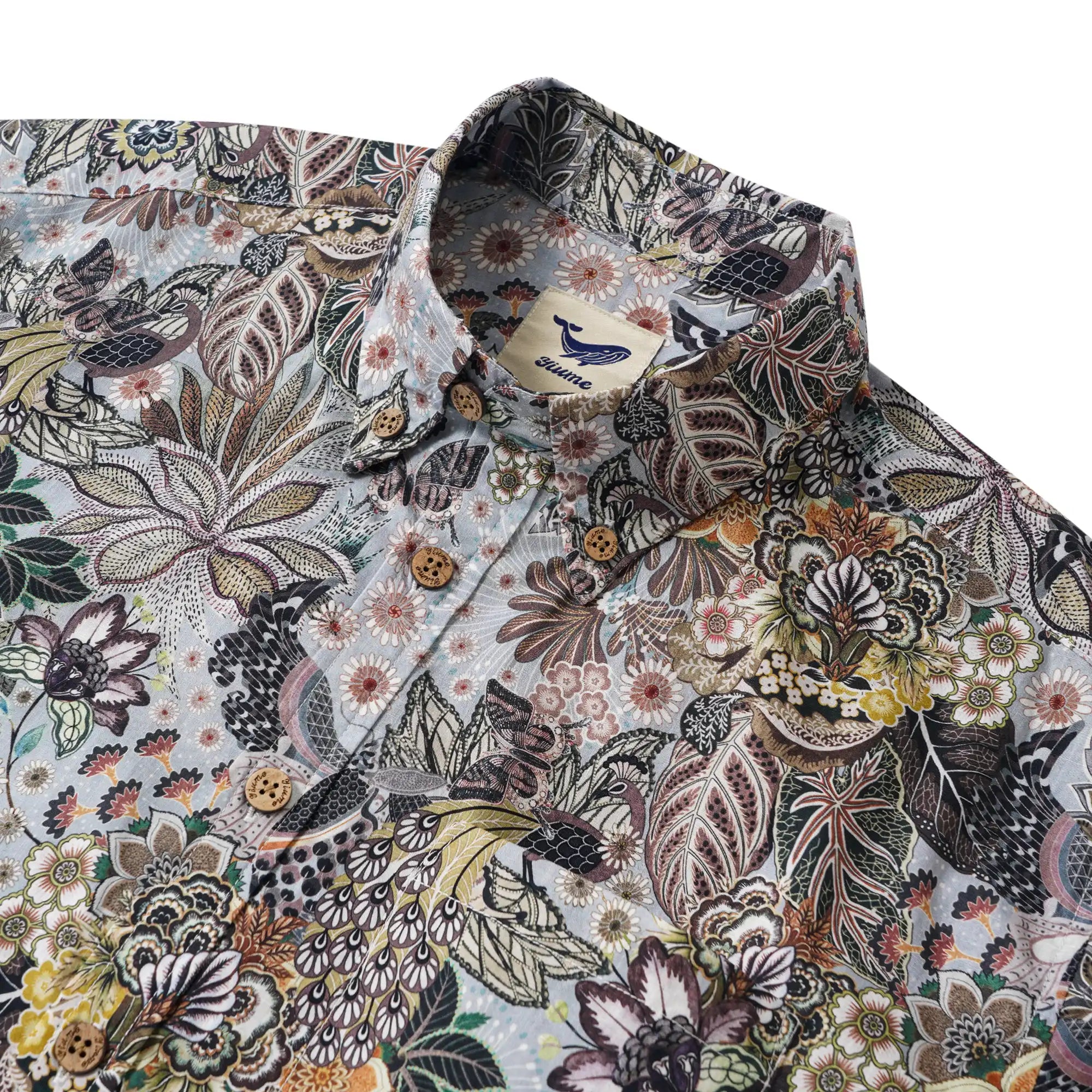 Inspired by vintage botanical gardens, this shirt features peacocks, butterflies, and plant motifs on a grey base. Designed for gentlemen, it serves as a subtle yet luxurious statement in business settings and an exclusive artistic emblem in social gatherings. Every detail embodies a philosophy of understated luxury. Wear it to embody an artistic jungle paradise, showcasing a relentless pursuit of texture and artistry in every appearance.