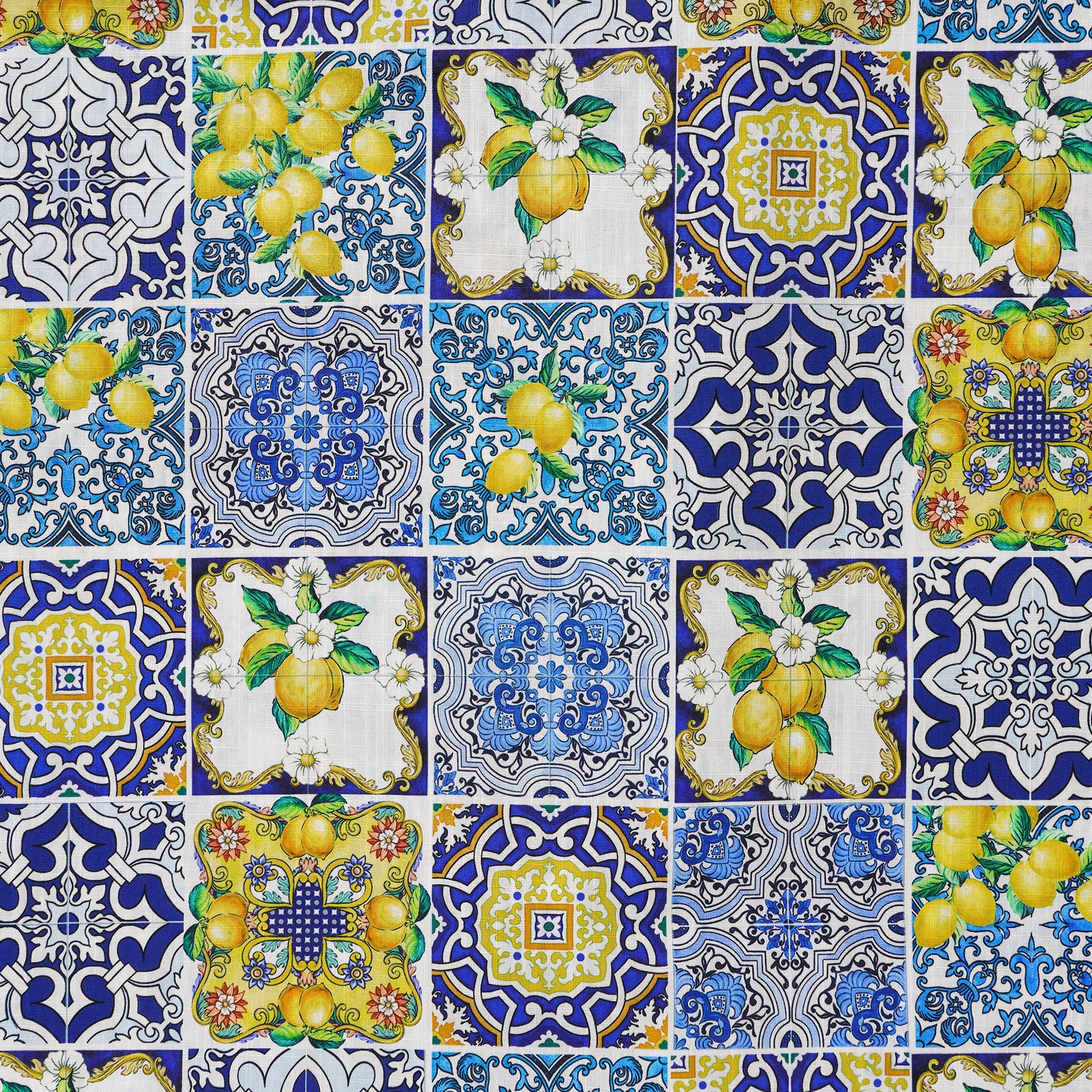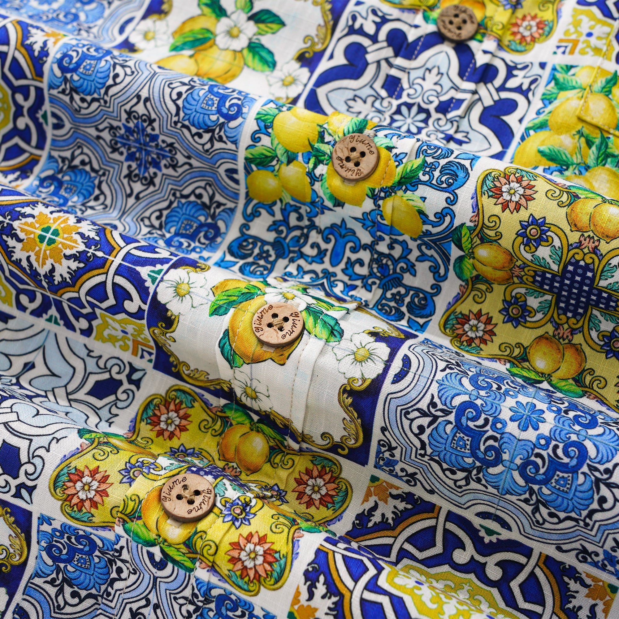 Cette œuvre mêle harmonieusement les styles baroque et gothique. Des motifs en relief complexes entourent un motif central de citron, rehaussant son opulence. Le citron symbolise le soleil et constitue le cœur du motif. Le jaune vif des citrons, juxtaposé aux bleus arabes, apporte une touche vivante et dynamique à l'ensemble, telle des notes de musique s'entrelaçant dans une symphonie, créant une mélodie unique d'inspiration sicilienne. La composition carrée met en valeur la beauté géométrique et le charme unique des motifs siciliens.