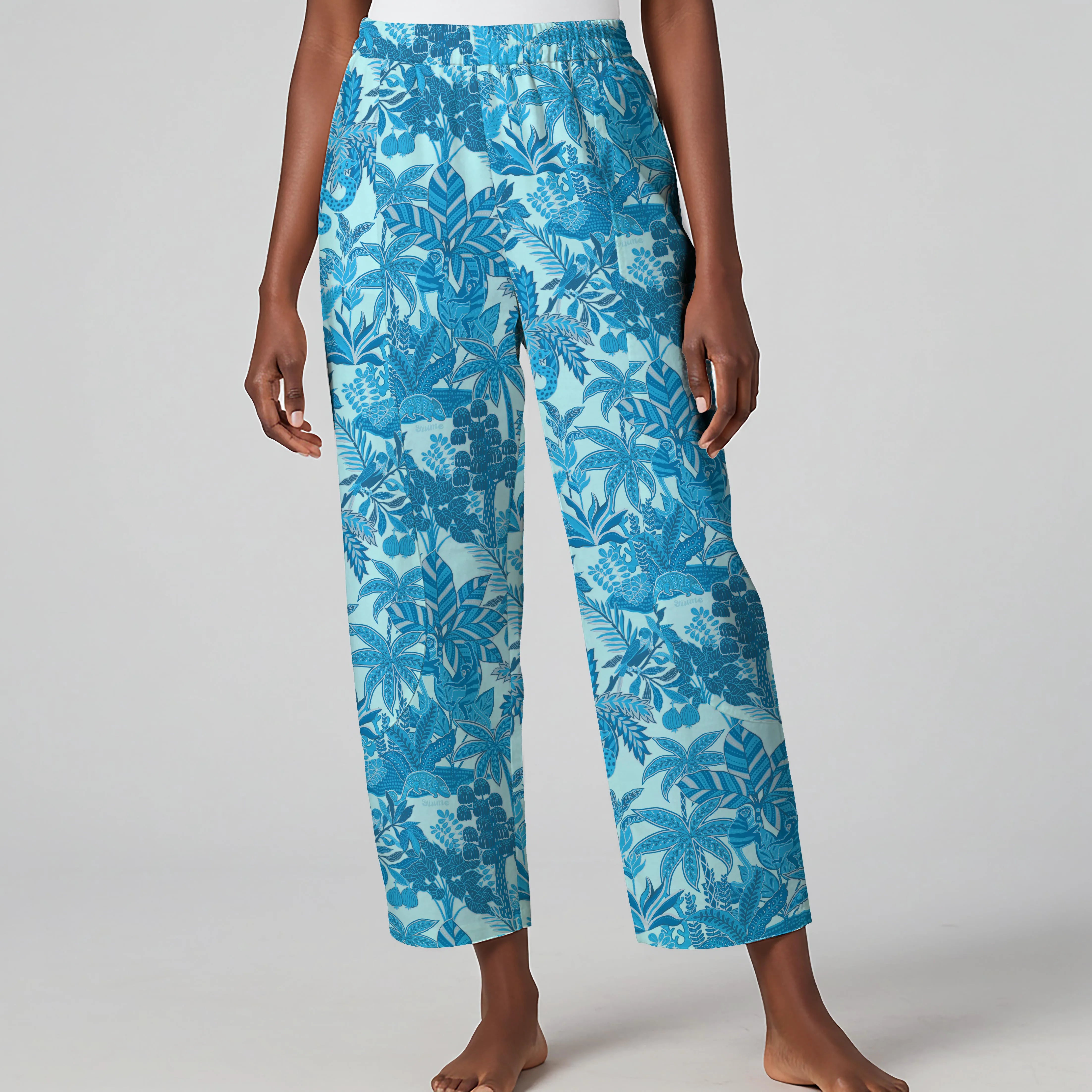 Women Casual Ankle Pants Lounge Elastic Waist with Pockets 93% Lyocell, 7% Linen Blue Aloha Jungle Paradise