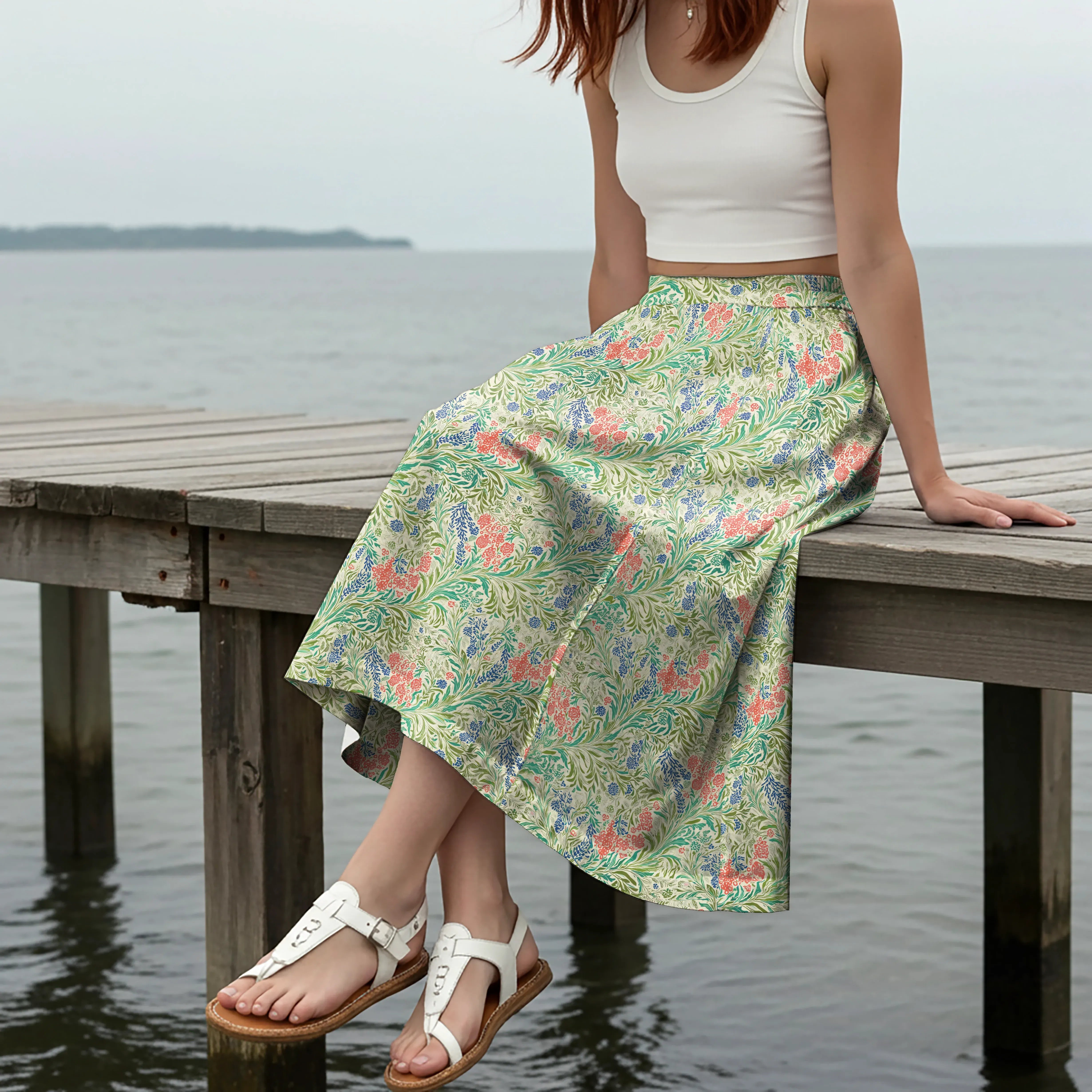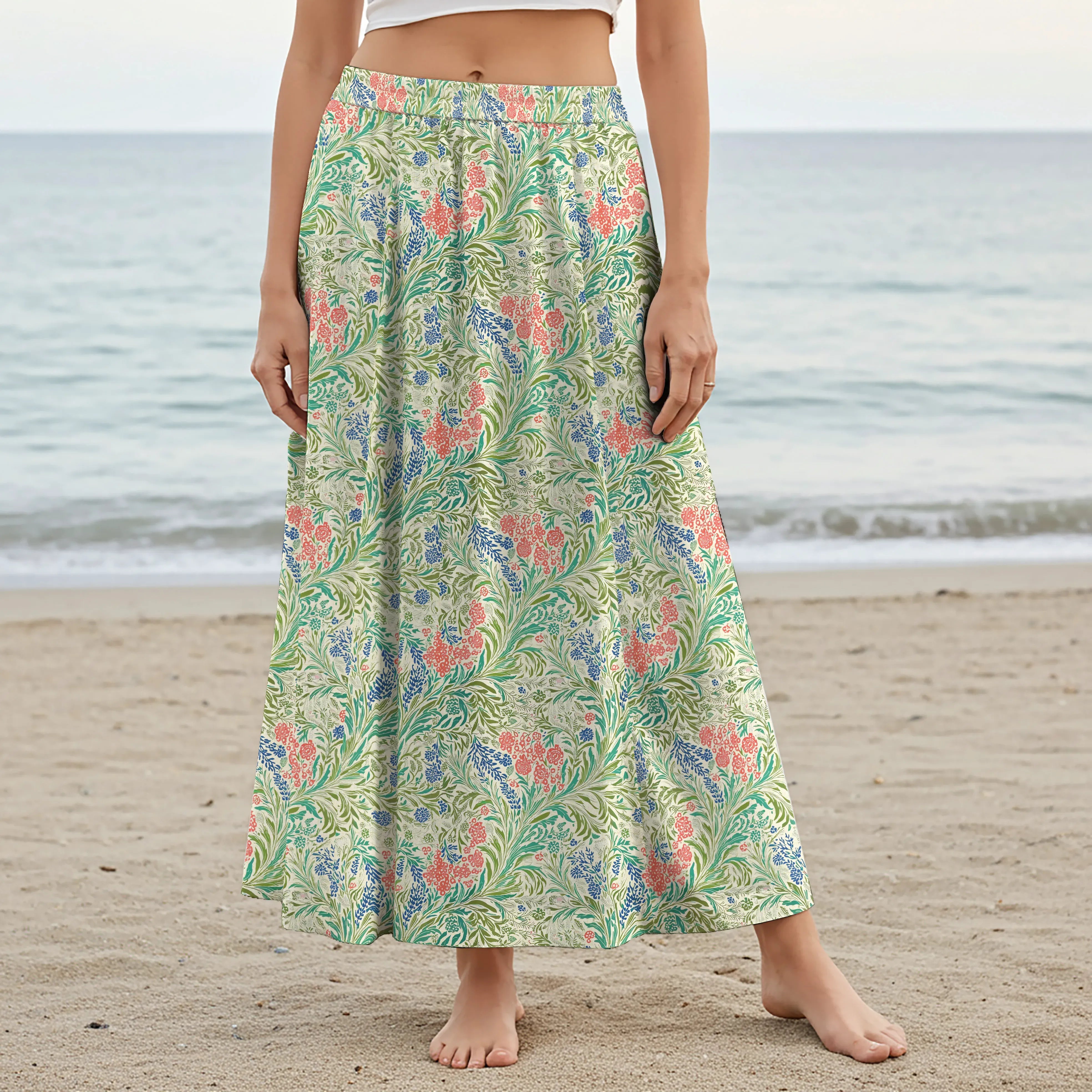 Women Casual Maxi Skirt Long Elastic Waist with Pockets 100% Cotton Green Aloha Alfalfa Flower Earthly Weave
