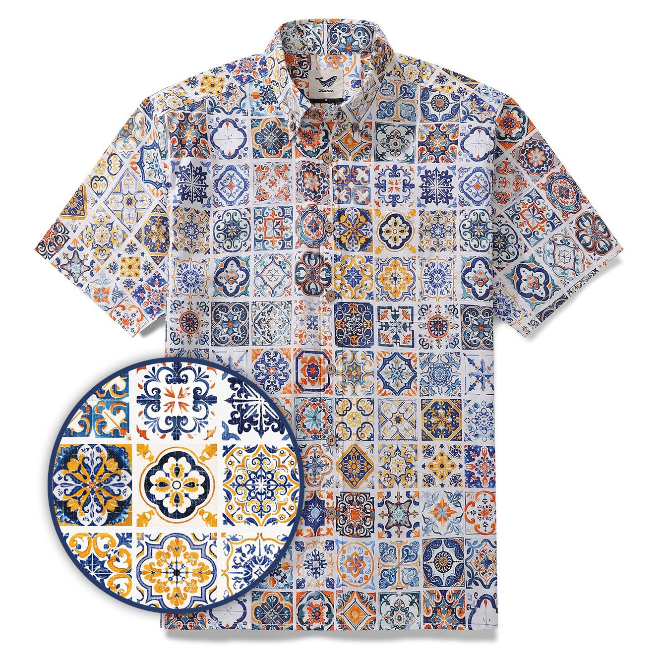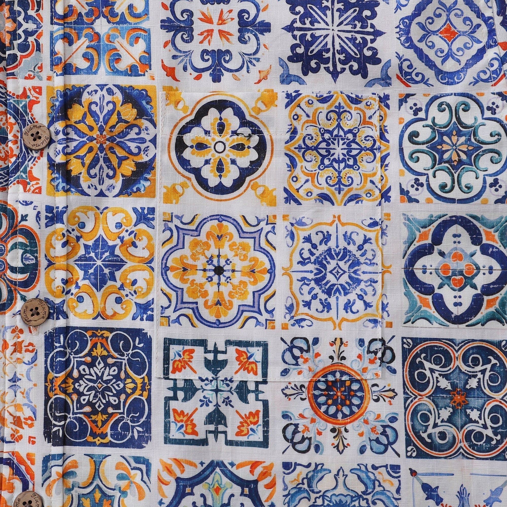 Les éléments culturels dans le motif se reflètent principalement dans les motifs décoratifs, rappelant la riche histoire des céramiques méditerranéennes, des carreaux et des arts. Les motifs de style carreau évoquent des sentiments d'éternité, de tradition et de savoir-faire. Cette chemise n'est pas qu'un simple vêtement - c'est un voyage immersif vers la côte italienne sous le soleil de l'après-midi, offrant une expérience de confort avec la cuisine locale et les brises marines.