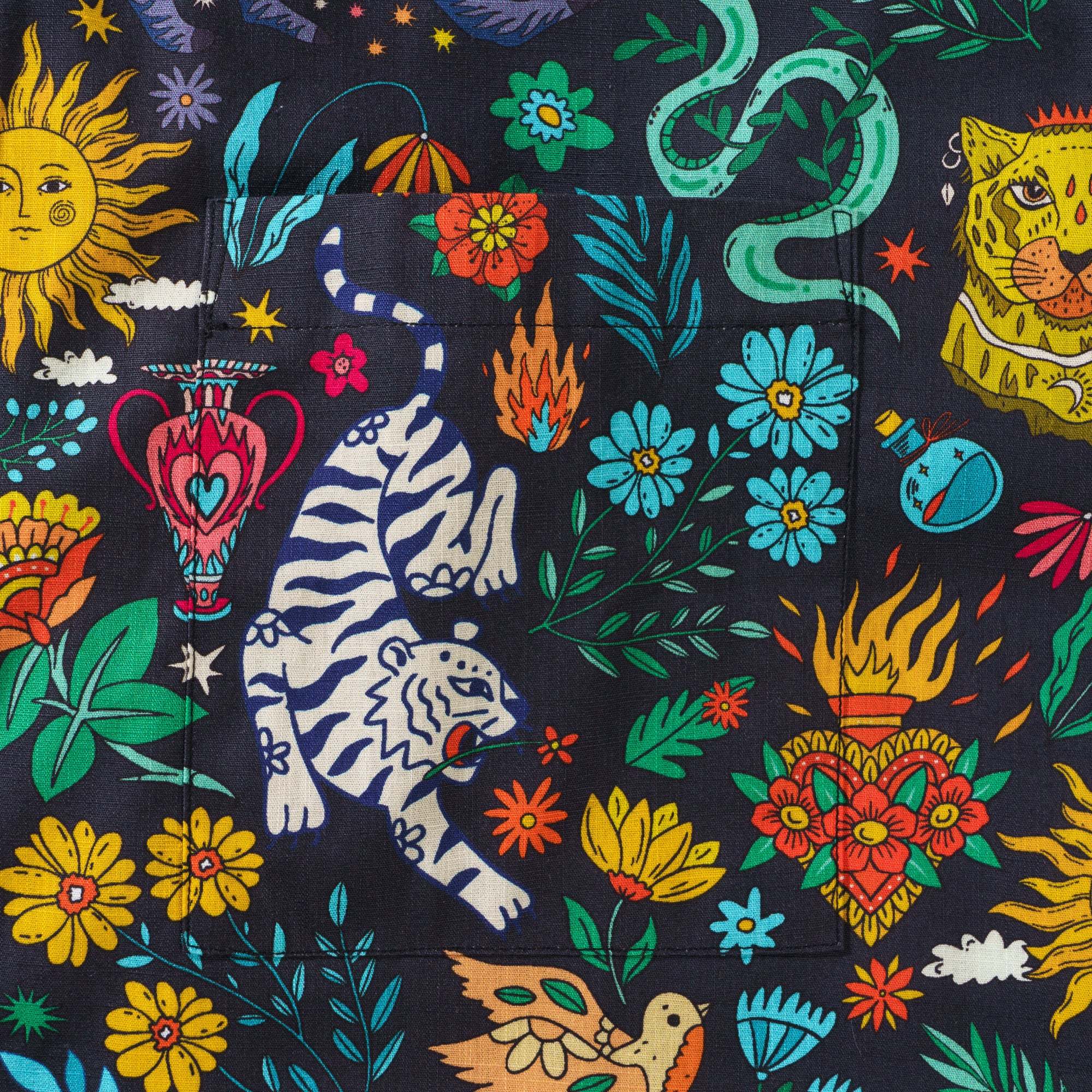 Inspiré par la beauté naturelle et le mystère de la mythologie, ce design incarne la vitalité et le récit. Un puissant tigre et une panthère noire énigmatique errent à travers un feuillage luxuriant, gardant ce royaume sacré. Cupidon, débordant d'amour, vise avec son arc et ses flèches, travaillant sans relâche pour le bonheur. Le soleil chaud et le cœur ardent symbolisent la passion et la vitalité, créant une énergie positive aux côtés de fleurs épanouies.